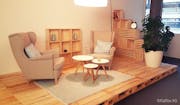 Uns wurde schnell klar, dass die Kisten mit vielen dekorativen Elementen gefüllt werden müssen. Also machten wir uns auf den Weg in die Brocki und zu IKEA. Über Pflanzen, Kakteen und Vasen bis hin zum Bügeleisen war alles dabei. Ständig wurden die Kisten nochmals neu geordnet, anders aufgestellt und verändert, bis wir irgendwann mit dem Endergebnis zufrieden waren. Doch neben all den Kisten waren wir natürlich auch auf der Suche nach Möbel und grossen Pflanzen. Wir haben viele Angebote verglichen und überall versucht das beste rauszuholen. Unser Team besteht zwar nicht aus Dekorateuren oder Einrichtungexperten, aber dennoch sind wir ein bisschen stolz auf das Endresultat von unserem Wohn- und Esszimmer. Da unser Büro mit einen dunklen Teppich ausgelegt ist, haben wir uns dazu entschieden, den Wohnbereich mit Paletten zu untermauern, um die Räumlichkeiten etwas aufzuhellen. Die Möbel haben wir bei IKEA bzw. home24 gekauft. Die grossen Pflanzen haben wir nach einer Beratung bei Wyss Samen und Pflanzen AG bestellt. Sie haben nicht nur den Schall gedämmt, sondern auch den wohnlichen Bereich vom Arbeitsplatz getrennt und sorgen sogar für saubere Luft.