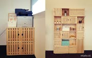Im Gang und im Arbeitsbereich haben wir mit den Kisten zwei Regale gebaut, die Stauraum und Platz für Pflanzen, Büromaterialien etc. geschafft haben. Und sogar unser Drucker hat auf den Kisten seinen neuen Platz gefunden. Damit auch unser Büro-Hund Romeo nicht zu kurz kommt, hat er seine eigene Kiste mit Türchen für die "privaten" Sachen. Auch viel Grümpel konnte dank verschliessbaren Kisten unsichtbar verstaut werden.