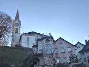 Die reformierte Kirche liegt knapp unter dem Schlosshügel. Die grossen Säulen vor dem Eingangsbereich der Kirche erinnern an einen antiken, griechischen Tempel. Die Kirche ist als Kraftort bekannt.