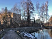 Die Kawamata-Brücke besteht aus schwimmenden Balken, Latten und Leisten und erinnert an einen Biberbau. Die Brücke verbindet das Nord- mit dem Südufer des Zwellweger-Weihers und wurde von Tadashi Kawamata realisiert.