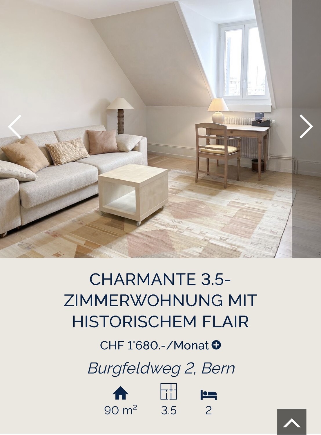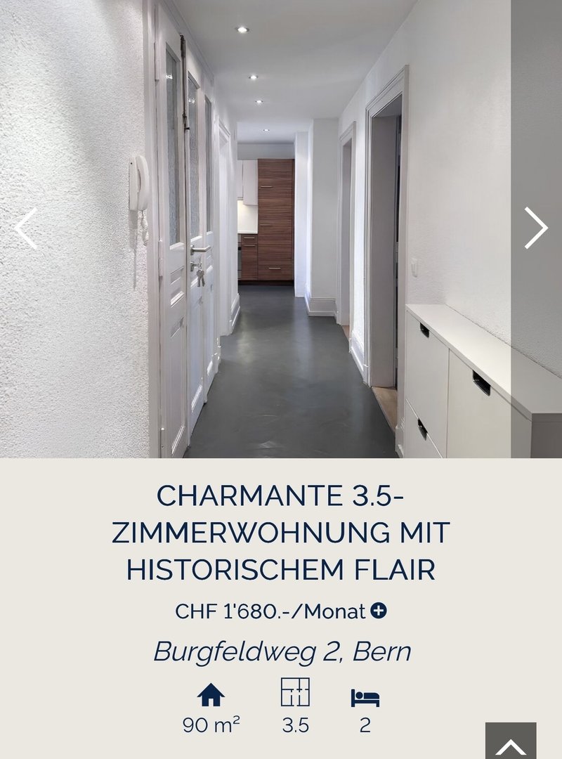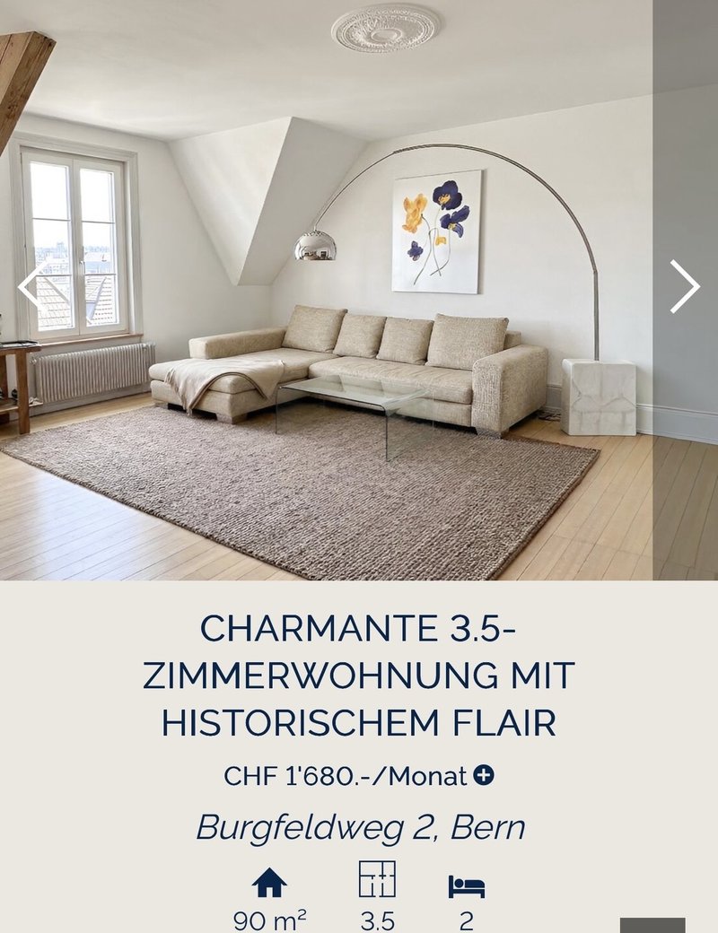 Diese grosszügige 3.5-Zimmer-Dachgeschosswohnung aus der Jahrhundertwende (ca. 1900) befindet sich im begehrten Burgfeldquartier und vereint historischen Charakter mit zeitgemässem Wohnkomfort. Die Liegenschaft wurde mit viel Liebe zum Detail renoviert, wobei der ursprüngliche Charme des Hauses bewahrt und harmonisch mit modernen Elementen ergänzt wurde.
