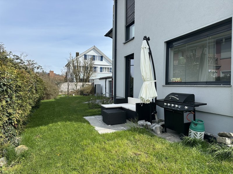 A true highlight is the spacious garden, featuring a comfortable outdoor sofa area and a grill, perfect for enjoying summer evenings and hosting friends in a relaxed setting.
