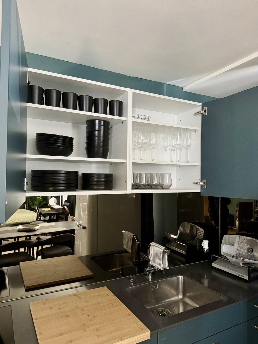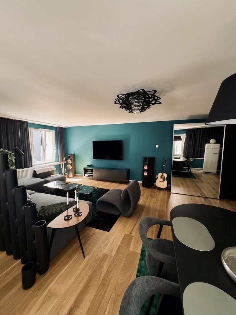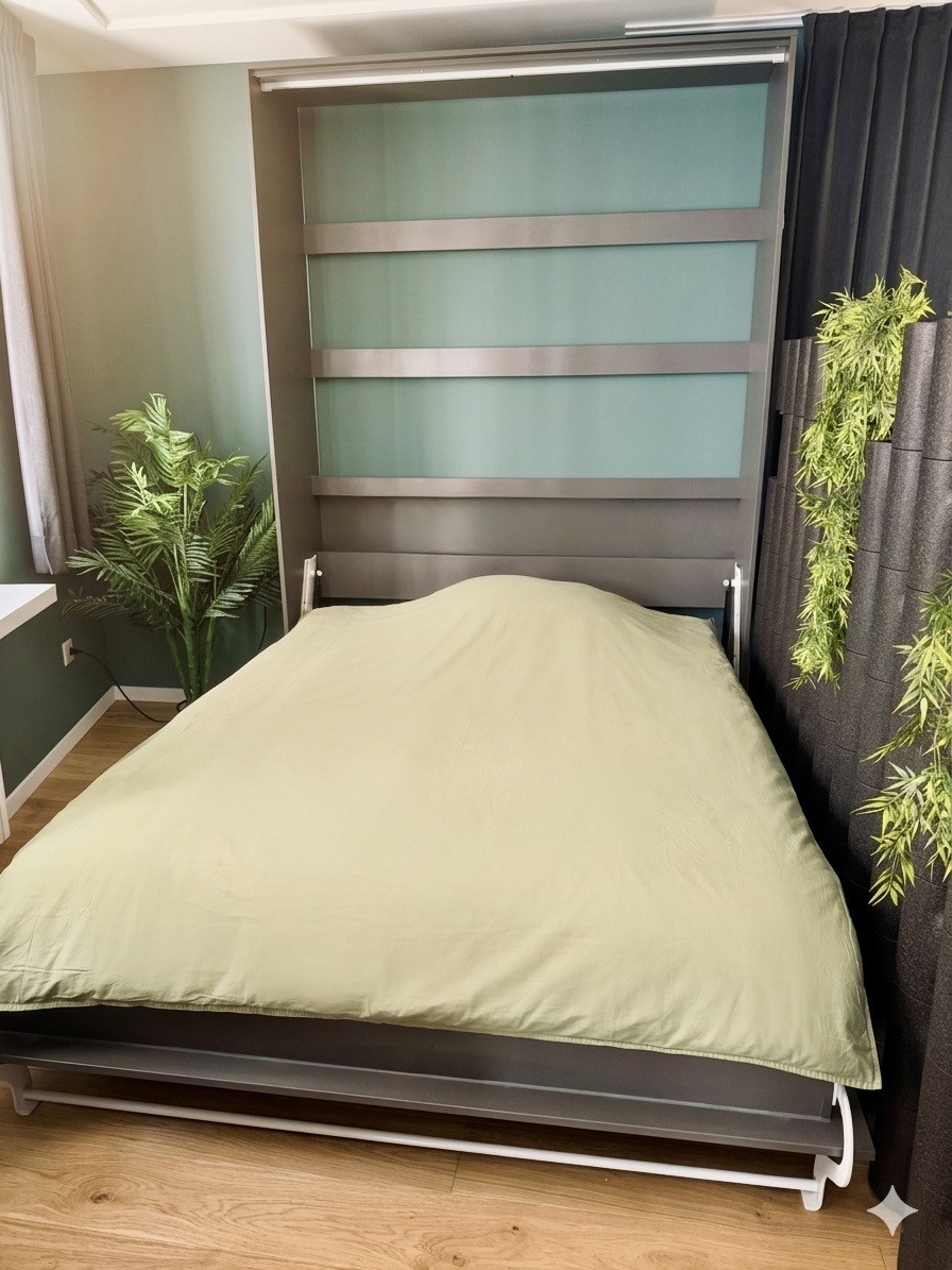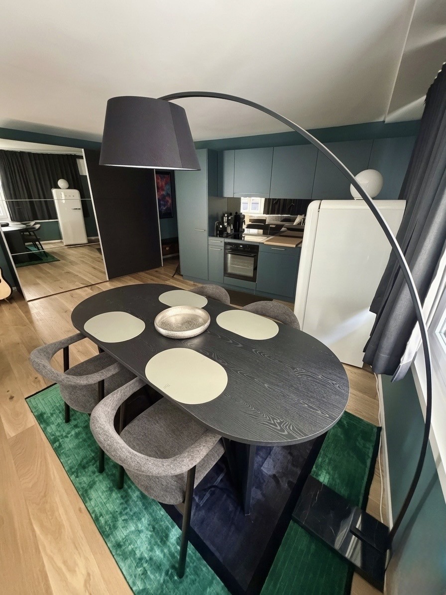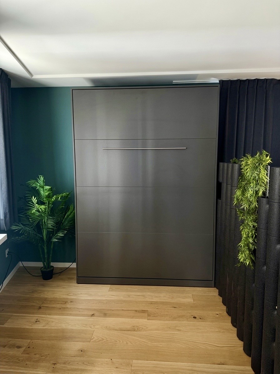 • Wohnen/Schlafen: Schrankbett mit Tempur-Matratze, 2m Esstisch für bis zu 5 Personen, Akustik-Trennwand zwischen Wohn/Schlafbereich und grosser Kleiderschrank.