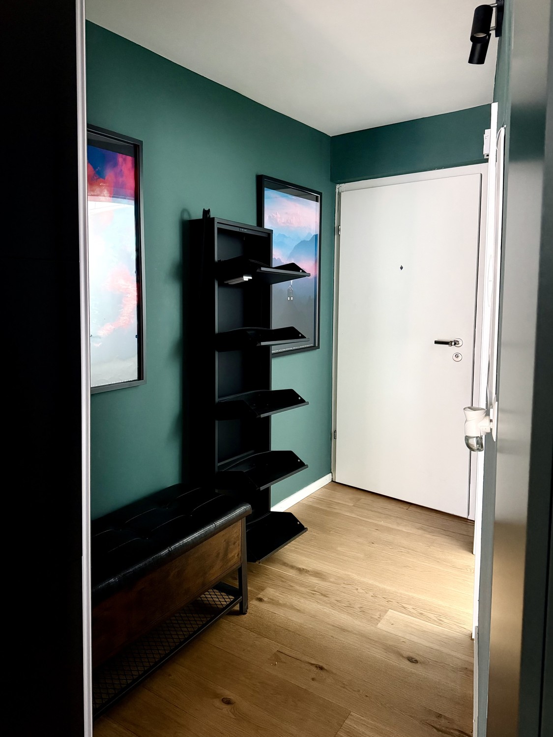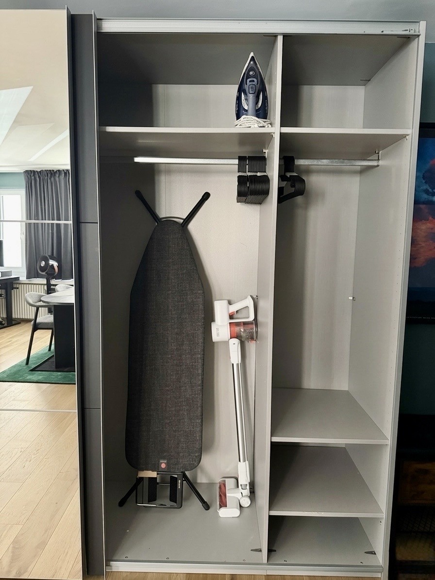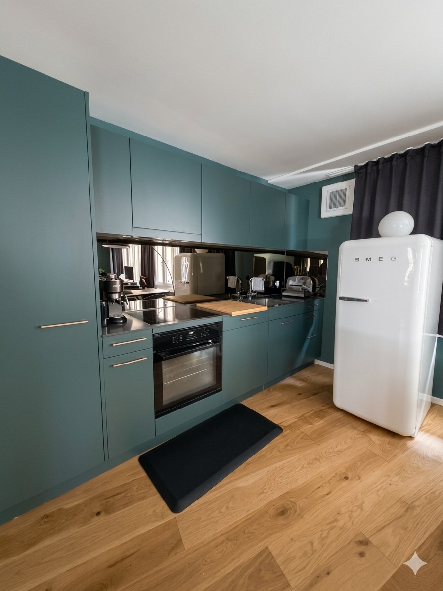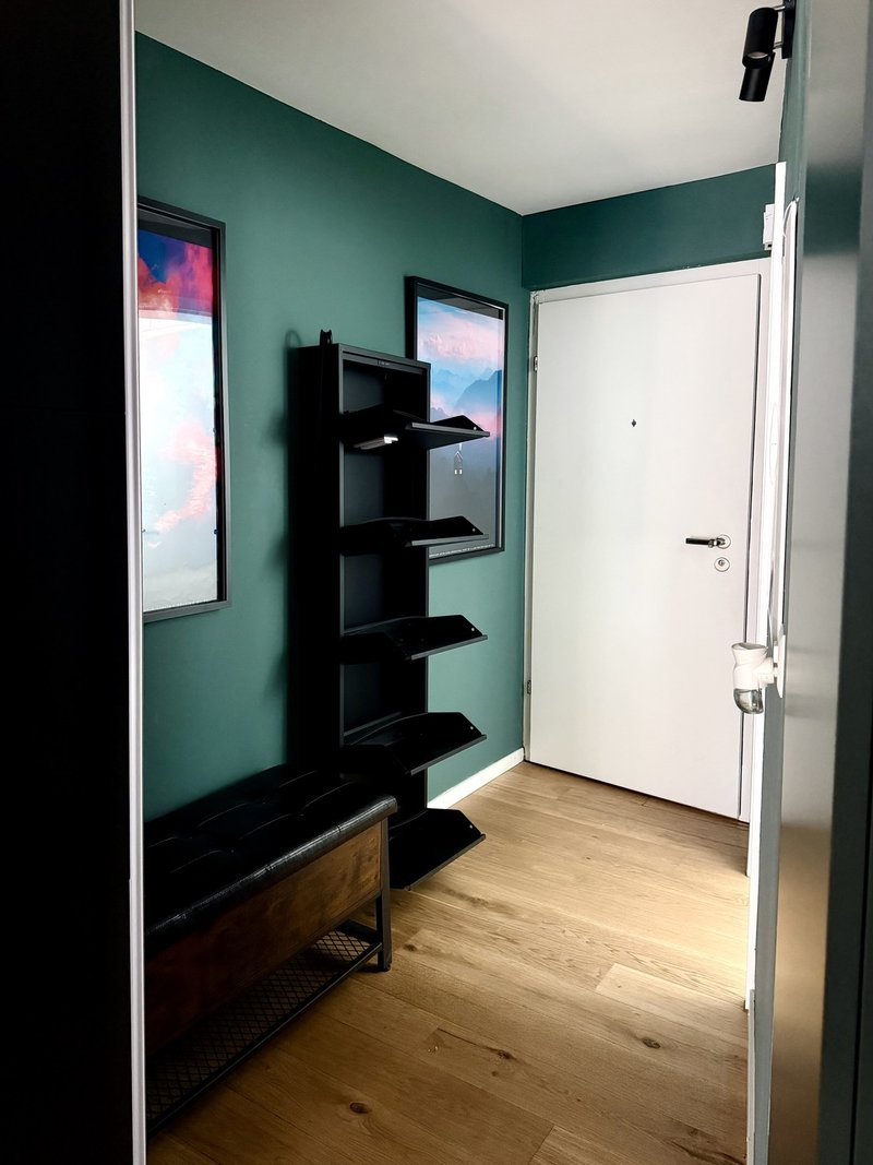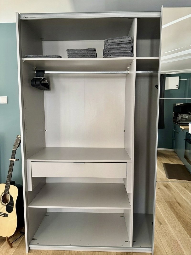 • Wohnen/Schlafen: Schrankbett mit Tempur-Matratze, 2m Esstisch für bis zu 5 Personen, Akustik-Trennwand zwischen Wohn/Schlafbereich und grosser Kleiderschrank.