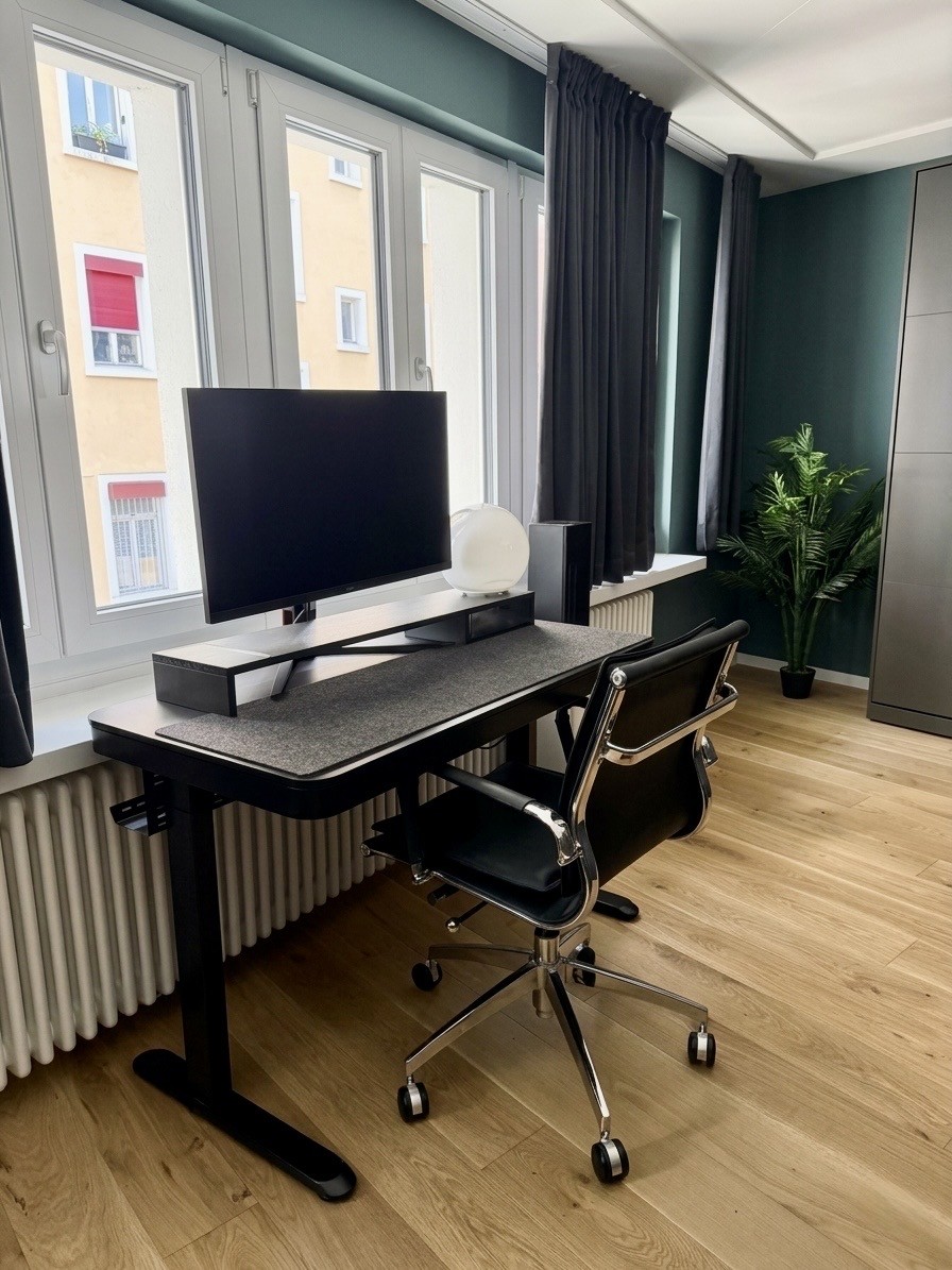 • Arbeitsplatz: Automatisch höhenverstellbarer Schreibtisch mit 34” High-Refresh Monitor und Glasfaser-Internet.