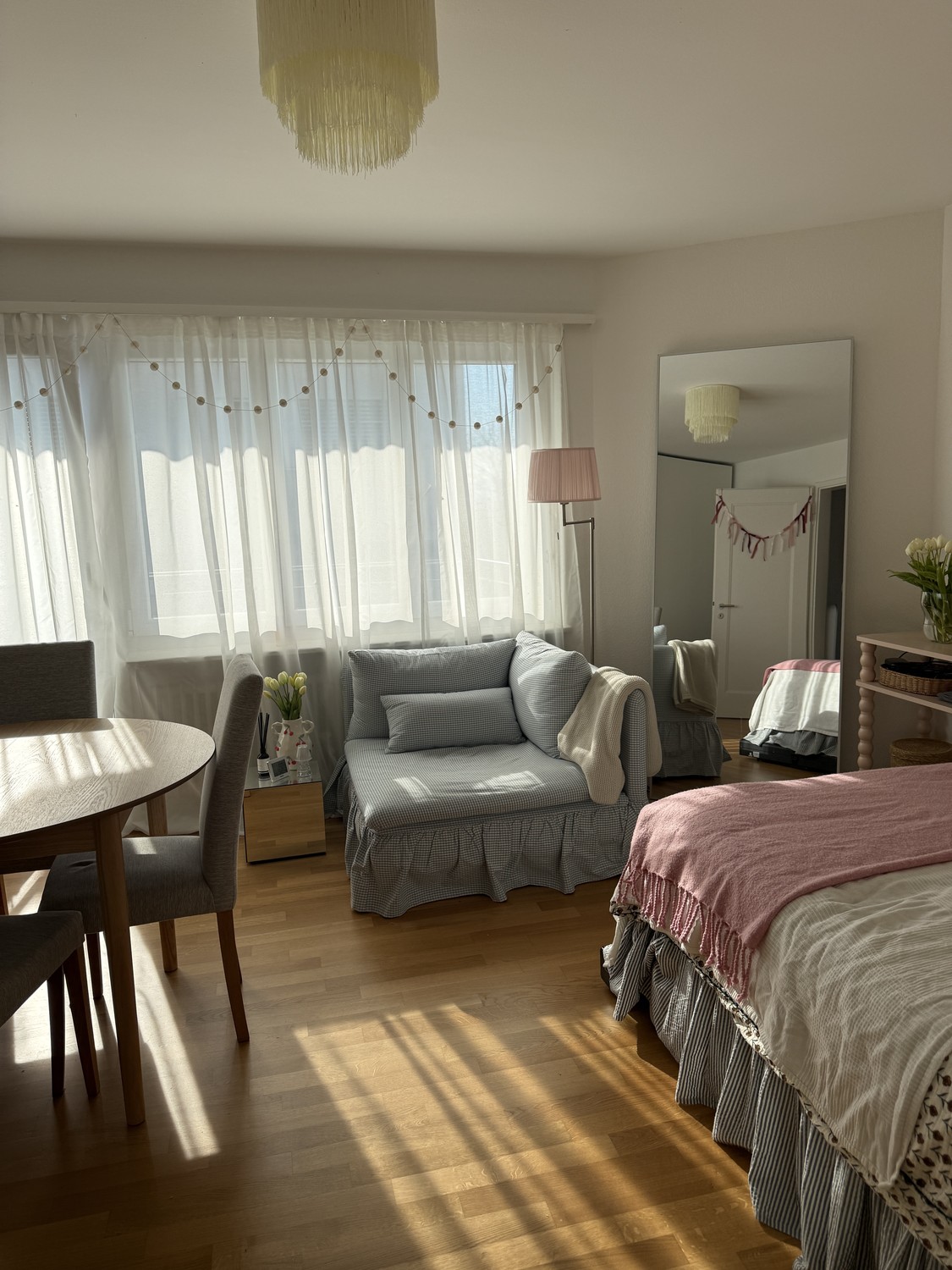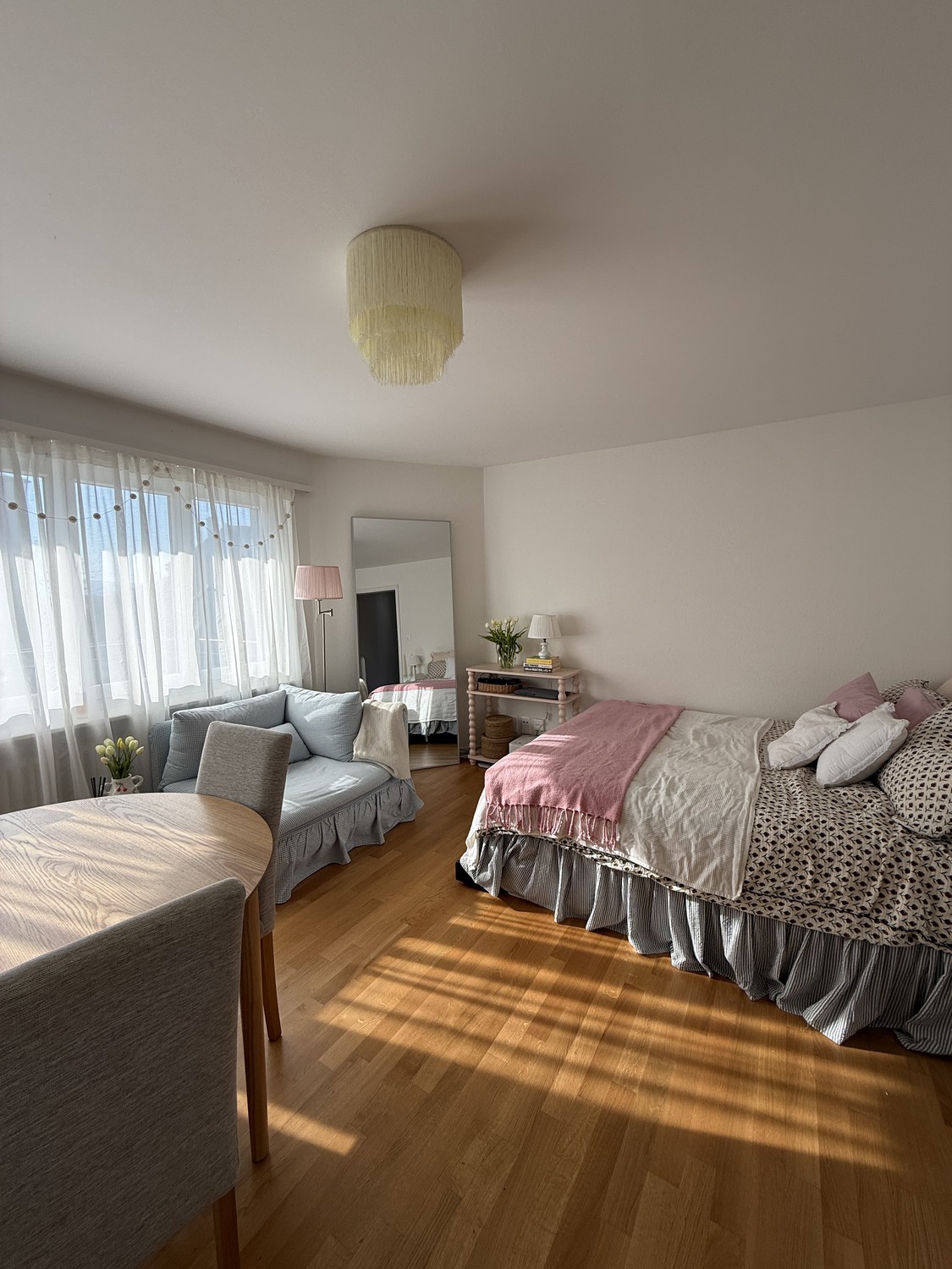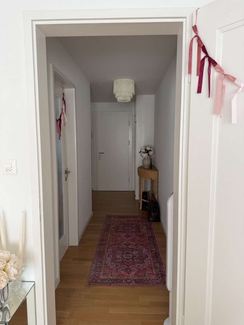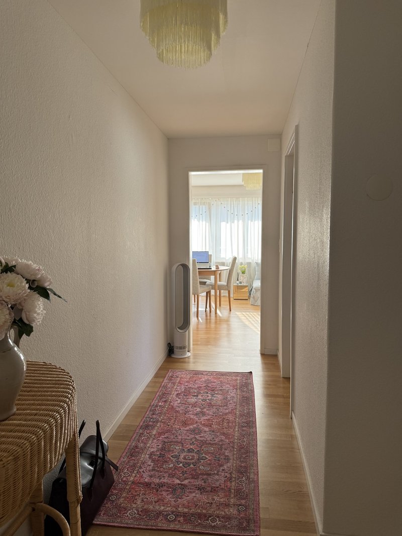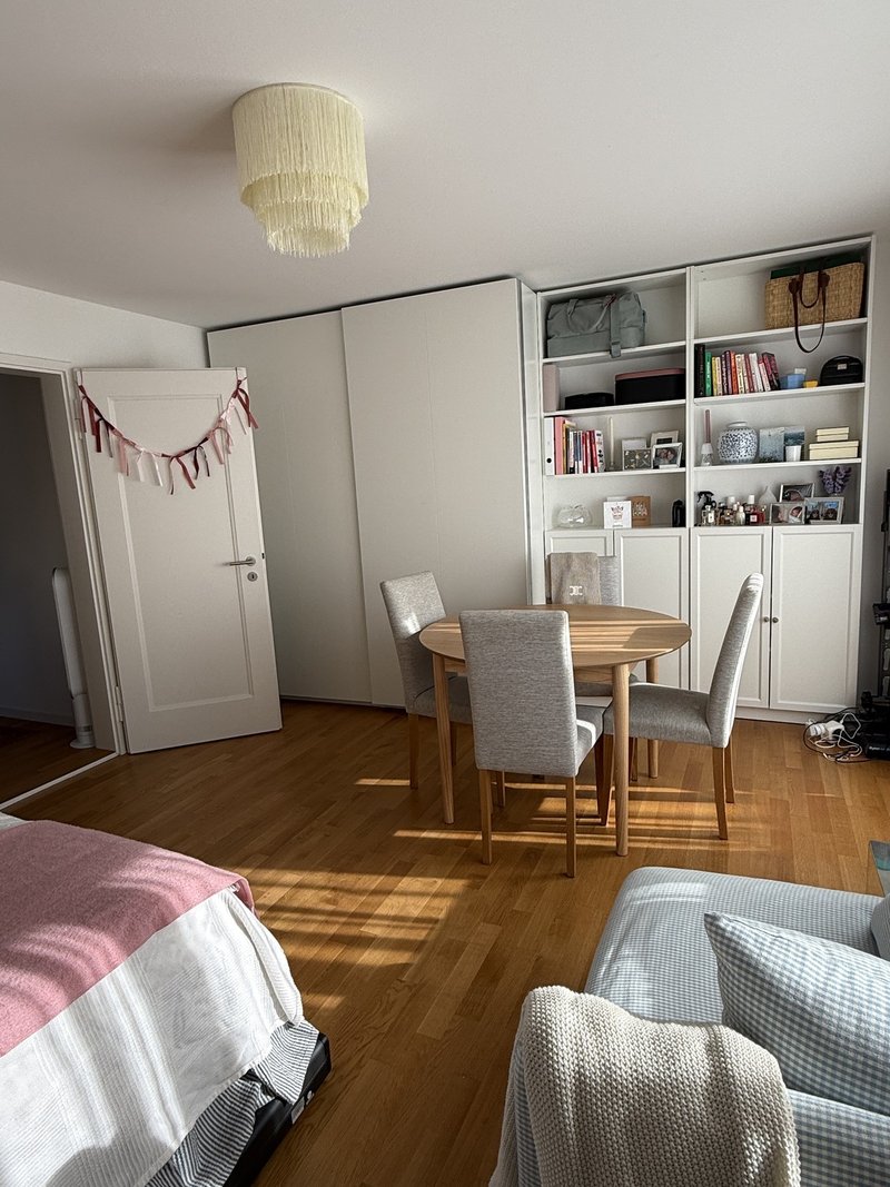 Some of the furnitures must be purchased by the next tenant for CHF 2’000 (it includes wardrobe, book shelves, bed frame, balcony table, corridor table, lamps, night table and armchair).