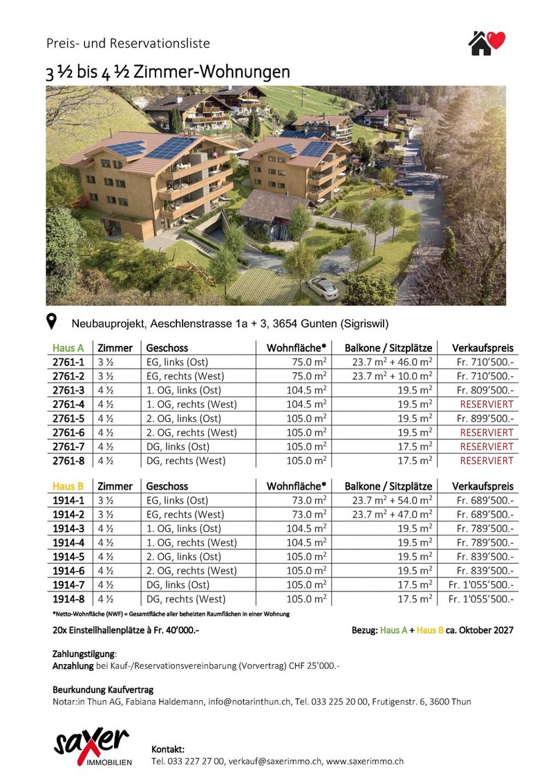 Die Eigentumswohnungen sind für die Nutzung als Erstwohnsitz vorgesehen. Eine Verwendung als Ferien- oder Zweitwohnsitz ist gemäss Gemeinde Sigriswil zurzeit nicht zulässig.