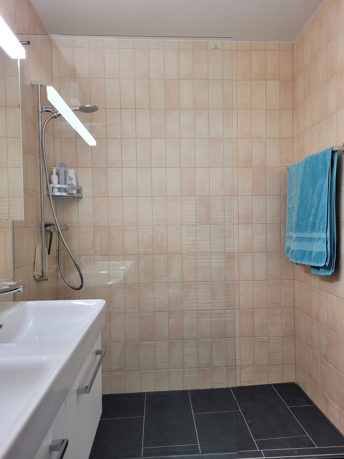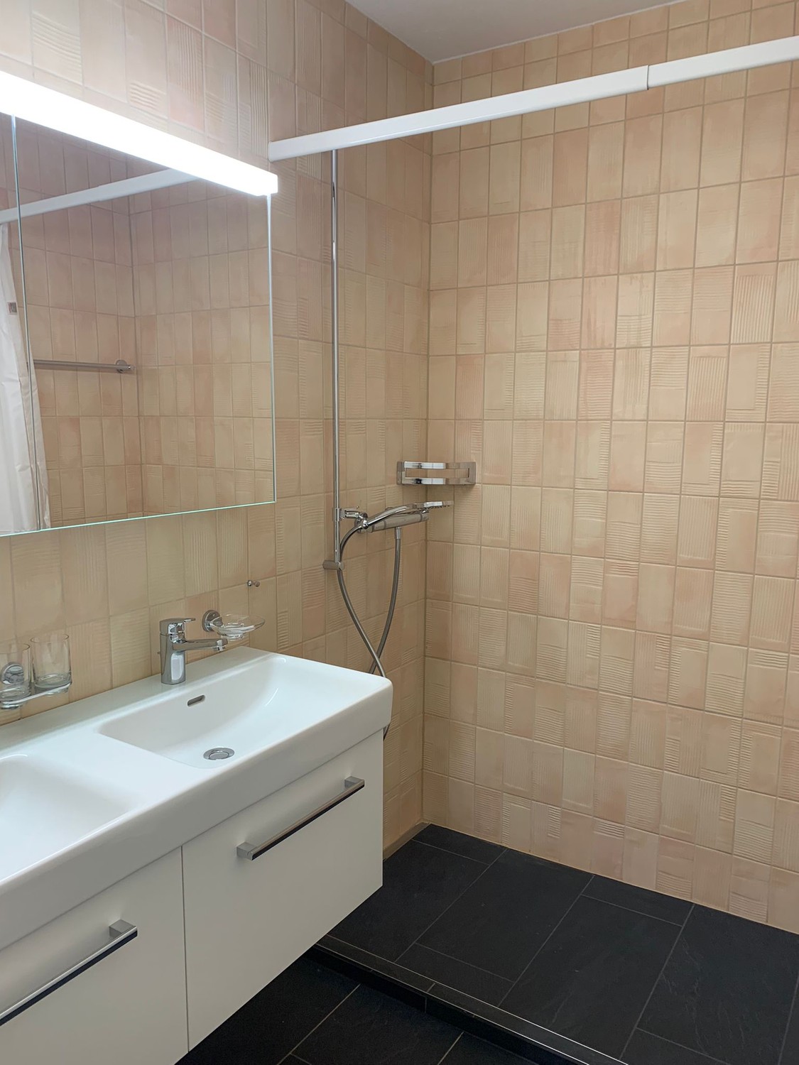 Modernes Badezimmer: Mit Doppelwaschbecken, Dusche und hochwertigen Fliesen