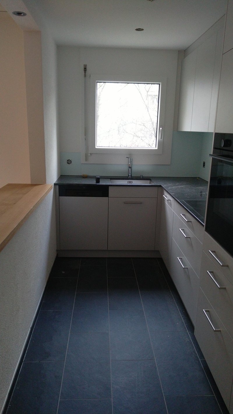 Moderne Küche: Vollständig ausgestattet mit weissen Schränken, Granitarbeitsplatte, eingebautem Backofen und Geschirrspüler