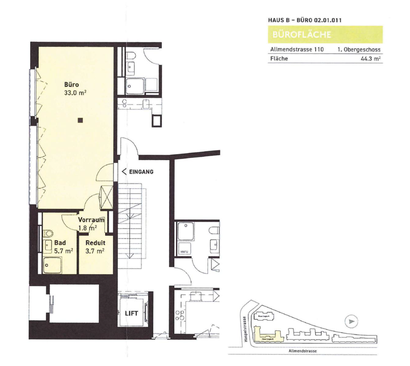 Die Bürofläche beträgt 44.3 m2 und eignet sich ideal für kleine Unternehmen, Start-ups oder Einzelbüros.
