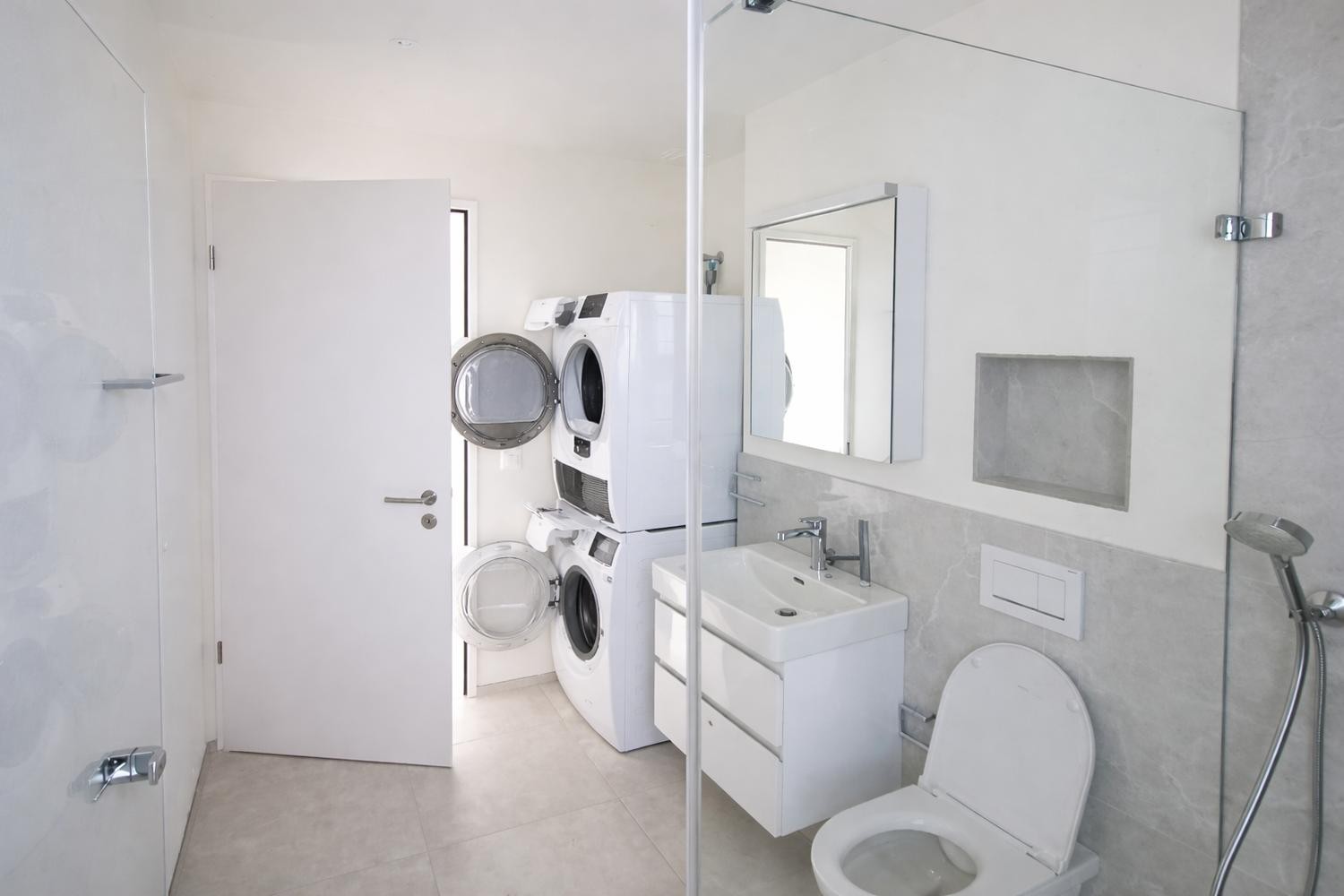 Badezimmer mit Waschmaschine und Tumbler in der Wohnung