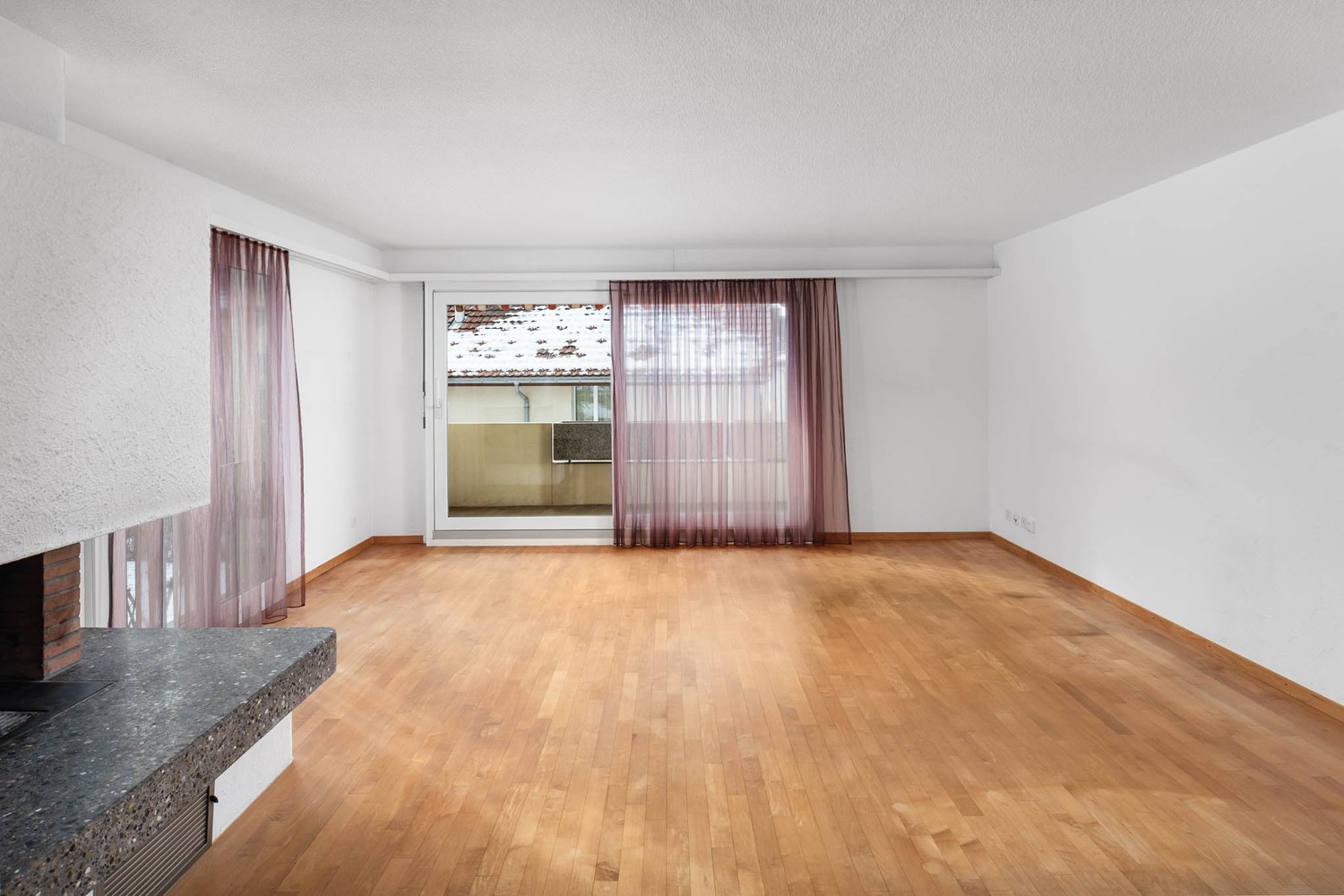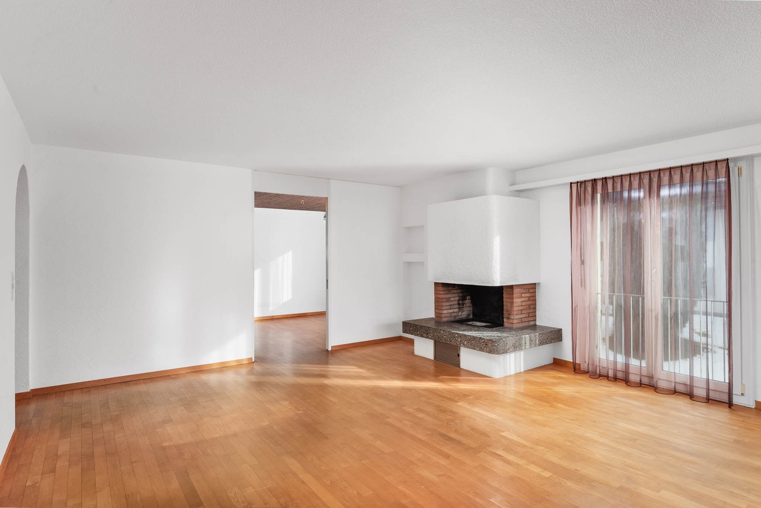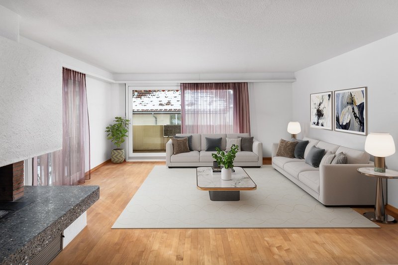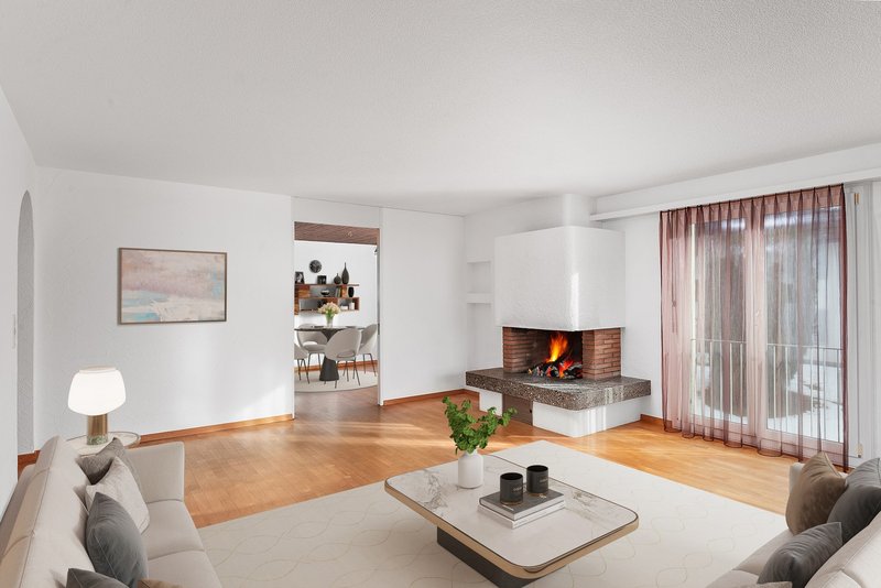 Ausstattung: Grosszügiges, lichtdurchflutetes Wohnzimmer mit Cheminée