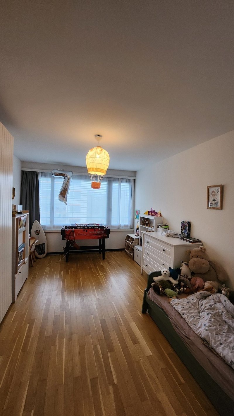 Die Wohnung befindet sich im 2. Stock und bietet freie Sicht auf den Innenpark. Sie verfügt über ein grosses Wohnzimmer mit angrenzendem Büro bzw. Bibliothek/Gästezimmer. Zudem gibt es ein Elternschlafzimmer, ein Kinderzimmer sowie ein Ankleidezimmer/Büro. Die grosszügige Küche bietet viel Platz, und die Wohnung verfügt im Reduit über eine eigene Waschmaschine und einen eigenen Tumbler. Die durchdachte Raumaufteilung macht die Wohnung ideal für Familien. Das James Quartier ist ein äusserst kinderfreundliches Wohnquartier, eingebettet in eine ruhige 30er-Zone.