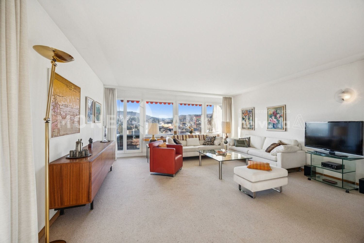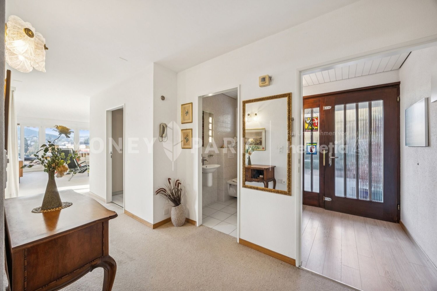 Wohnbereich und Küche: Der grosszügige Wohnbereich bietet viel Platz für individuelle Gestaltungsmöglichkeiten. Die geschlossene Küche ist praktisch gestaltet und ideal gelegen.
