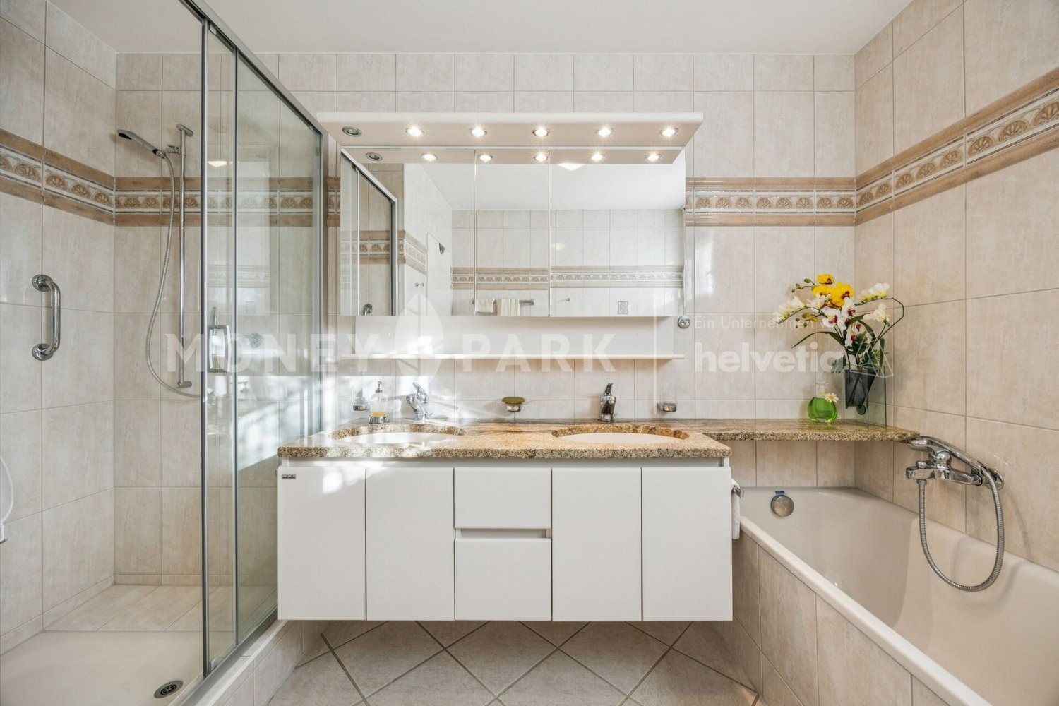 Badezimmer: Das Familienbad ist mit einer Badewanne, Dusche und Doppellavabo ausgestattet. Das Gäste-WC sorgt für zusätzlichen Komfort.