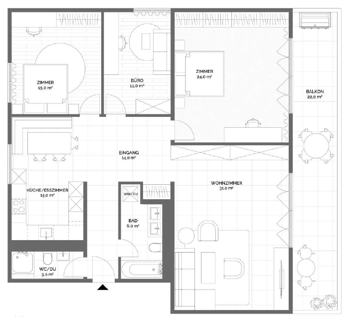 Die Wohnung liegt in einem ruhigen, grünen Quartier – ideal für alle, die urbane Nähe mit entspannter Wohnatmosphäre verbinden möchten.