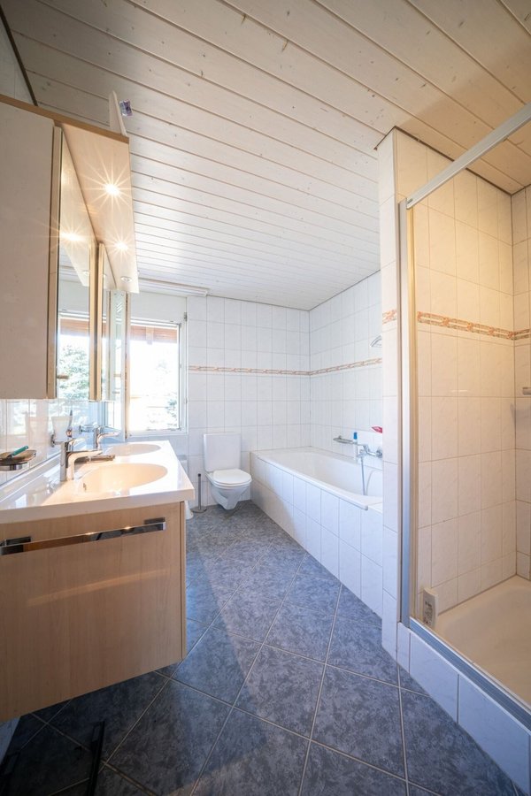 Das Obergeschoss bietet drei geräumige Zimmer, eines davon mit direktem Zugang zum Balkon. Das Badezimmer ist grosszügig gestaltet und verfügt über eine Badewanne, eine Dusche und zwei Waschbecken.