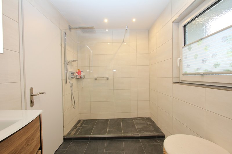 Über einen Treppenaufgang erreichen Sie das Obergeschoss. Hier sind der Wohn- und Essbereich mit Balkon, die Küche, zwei weitere Zimmer und eine geräumige Nasszelle (Dusche/WC/Lavabo) untergebracht.