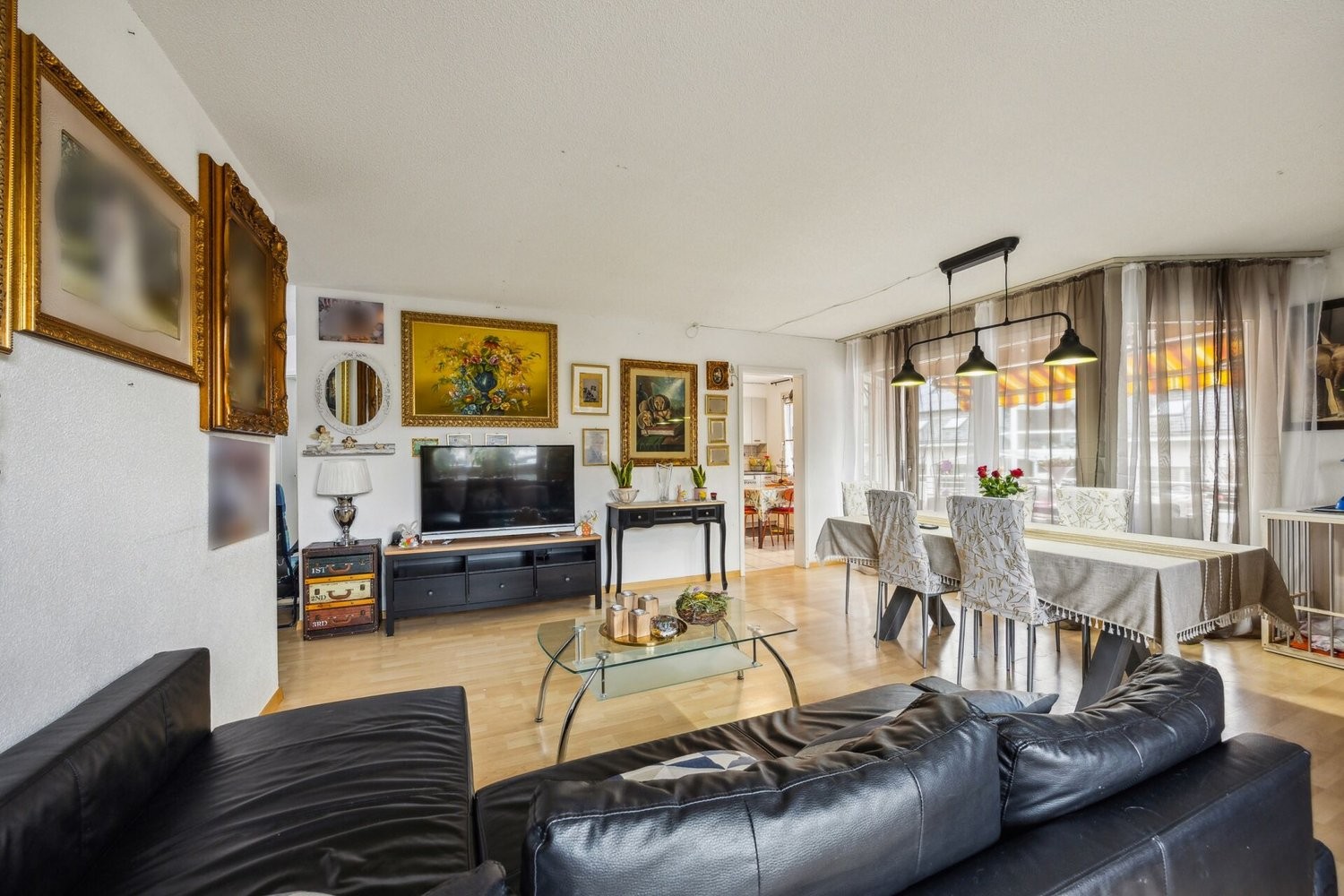 Angrenzend daran öffnet sich der grossflächige Wohn- und Essraum. Die durchdachte Raumstruktur ermöglicht vielfältige Möblierungsoptionen, ohne den Charakter des Raumes zu beeinträchtigen. Ein zentrales Element bildet das charmante Cheminée, das an kühleren Tagen für eine behagliche Atmosphäre sorgt und dem Raum eine besondere Note verleiht. Grosse Fensterfronten, die bis zum Boden reichen, lassen viel Tageslicht ins Innere strömen und schaffen ein helles, offenes Wohngefühl.