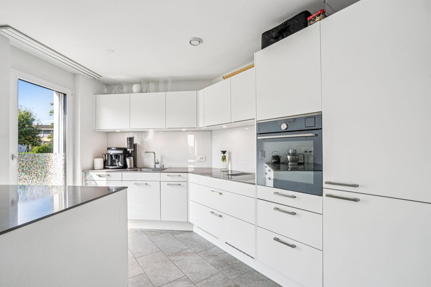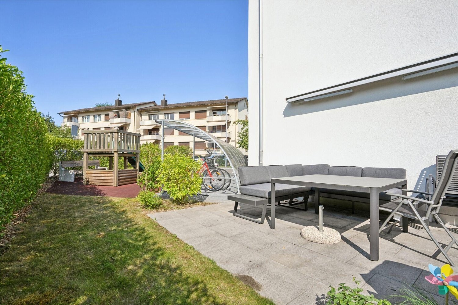 Ein architektonisches Highlight ist der direkte Zugang von der Küche über eine kurze Treppe auf den privaten Gartensitzplatz - gross, schön angelegt und dank elektrischem Sonnenstoren auf Knopfdruck beschattet; hier verlängern Sie Ihre Wohnfläche elegant ins Grüne und