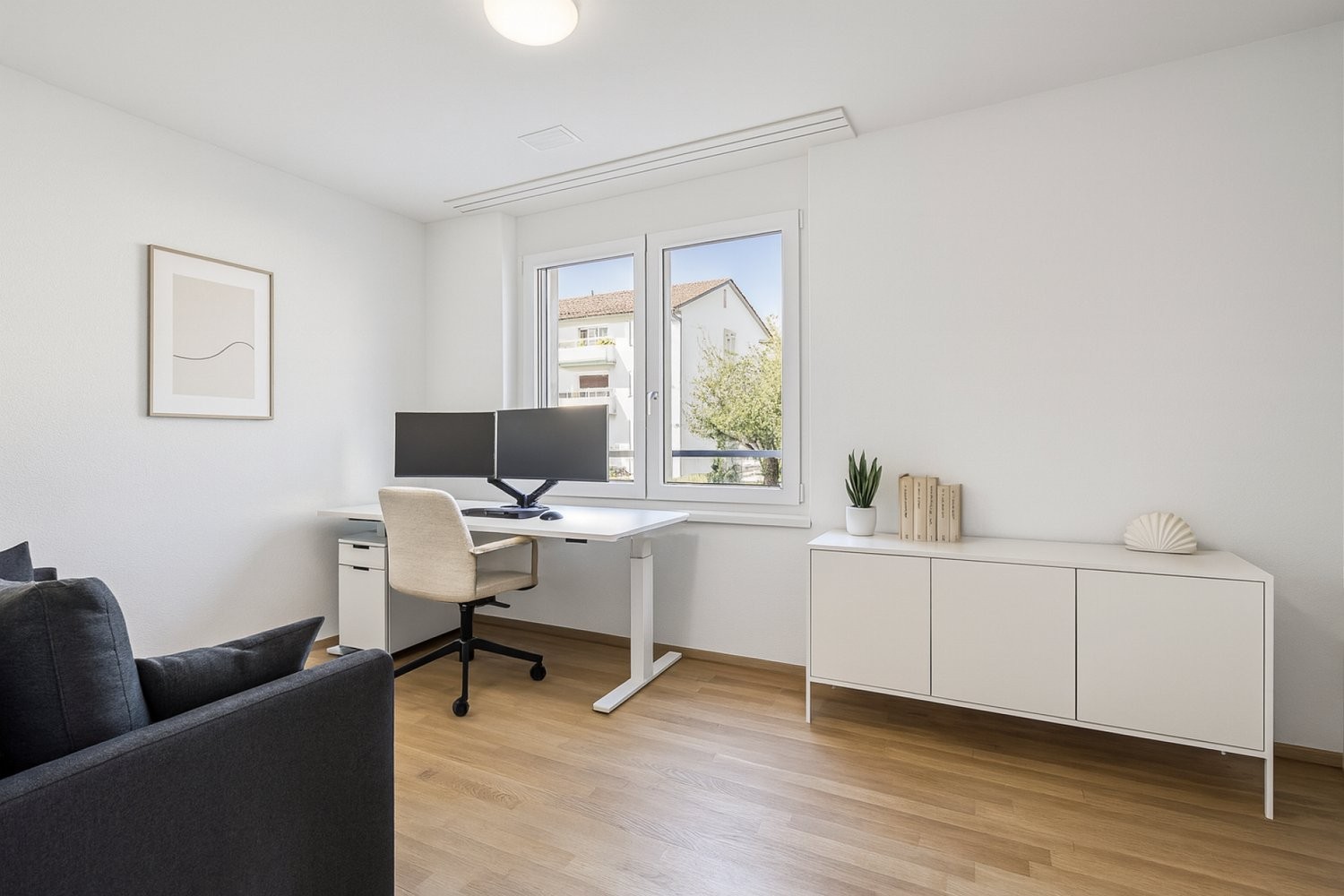 Sämtliche Lamellenstoren der Wohnung sind elektrisch bedienbar, die kontrollierte Raumlüftung und die behagliche Fussbodenheizung sorgen das ganze Jahr über für ein angenehmes Klima. Beim Entrée liegt zudem ein weiteres, vielseitiges Zimmer, das sich ideal als Homeoffice, Gäste oder Kinderzimmer eignet und den Alltagsrhythmus flexibel unterstützt. Der private Rückzugsbereich bildet das geräumige Schlafzimmer mit Bad en Suite - ein stimmiger Ort für Ruhe und Erholung mit kurzen Wegen am Morgen.