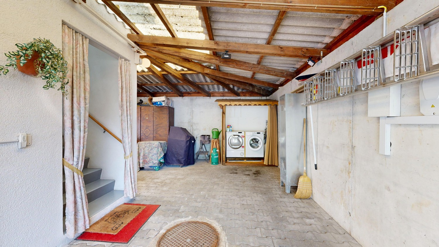 Eine Treppe führt von der Veranda im Obergeschoss ins Dachgeschoss. Dort befinden sich zwei unterteilte, grosszügige Estriche, welche beide über Fenster verfügen. Die Estriche wurden als Aufenthalts-/Hobbyraum genutzt. Im Untergeschoss finden Sie den Keller/Tank-/Abstellraum sowie zwei separate Kellerabteile. Der Vorplatz/Abstellplatz bietet Platz für etwa drei bis vier Autos. Vom Vorplatz aus gelangen Sie zum gedeckten Eingangsbereich/Waschküche mit Waschmaschine und Tumbler.