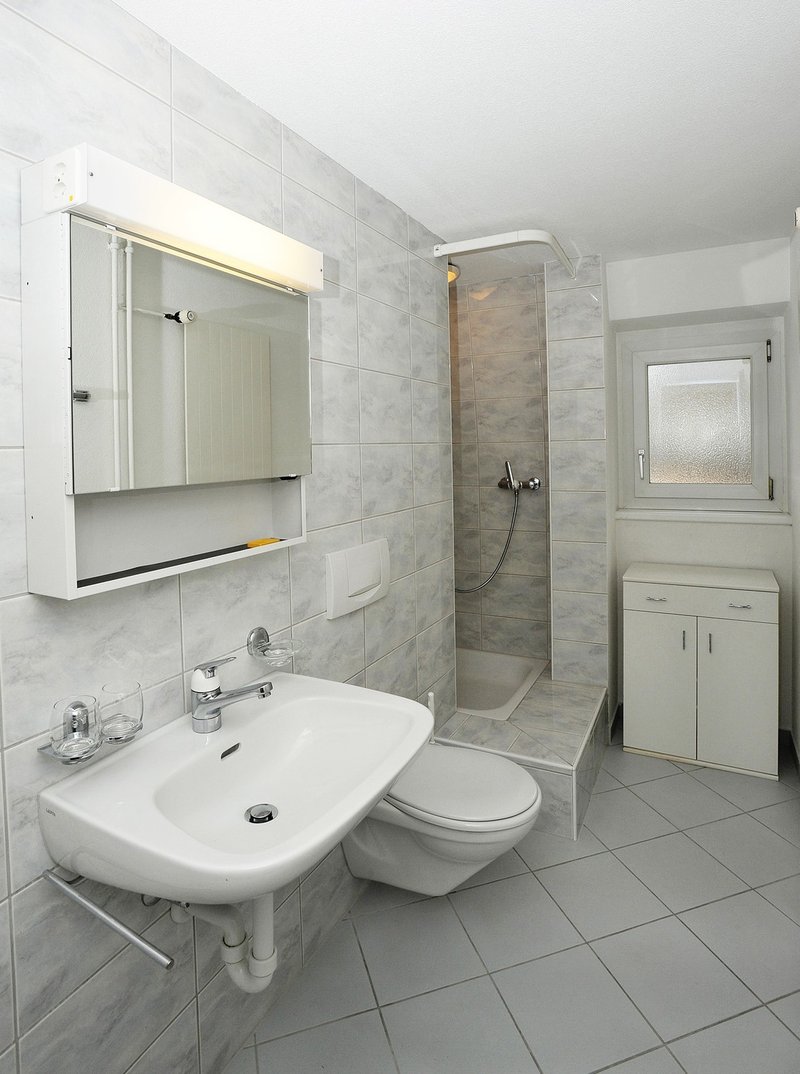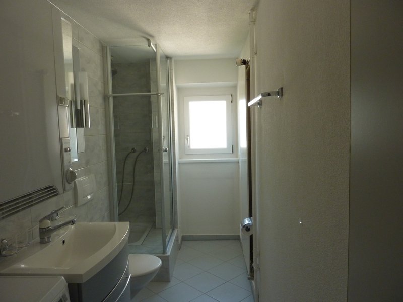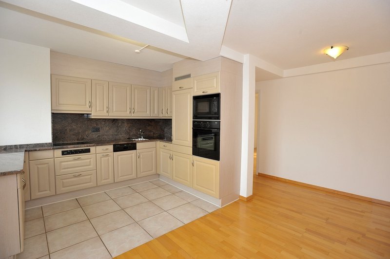 Parkett in der ganzen Wohnung. Steinplatten im Bad, WC und in der Küche.