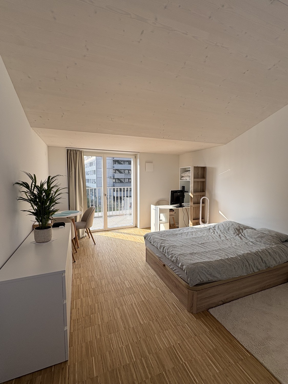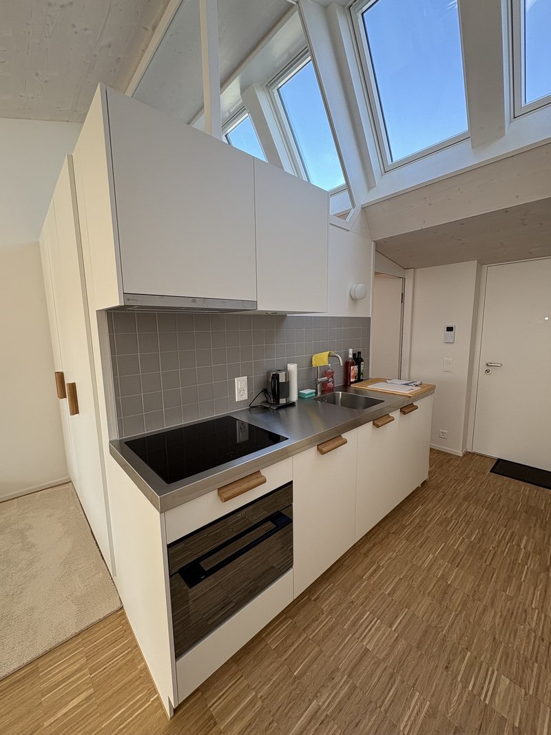 Ein helles und modernes voll möbliertes Studio-Apartment in Zürich Triemli, verfügbar ab 1. April 2026 für einen befristeten Aufenthalt von 3 bis 6 Monaten. Das Studio bietet einen komfortablen und gut gestalteten Wohnraum mit viel Tageslicht. Der offene Grundriss umfasst ein Doppelbett, einen Schreibtisch, einen Esstisch sowie Stauraum und Regale, wodurch sich die Wohnung ideal für Berufstätige, Praktikanten, Forschende oder Studierende eignet, die ein sofort bezugsbereites Zuhause suchen. Die Wohnung verfügt über eine moderne Küchenzeile, ausgestattet mit Kochfeld, Backofen, Spüle und Spülmaschine. Das private Badezimmer ist mit einer Dusche und modernen Armaturen ausgestattet. Ein besonderes Highlight der Wohnung ist der private Balkon, der einen offenen Ausblick bietet und einen angenehmen Ort zum Entspannen im Freien schafft. Das Gebäude ist modern, ruhig und sehr gepflegt.