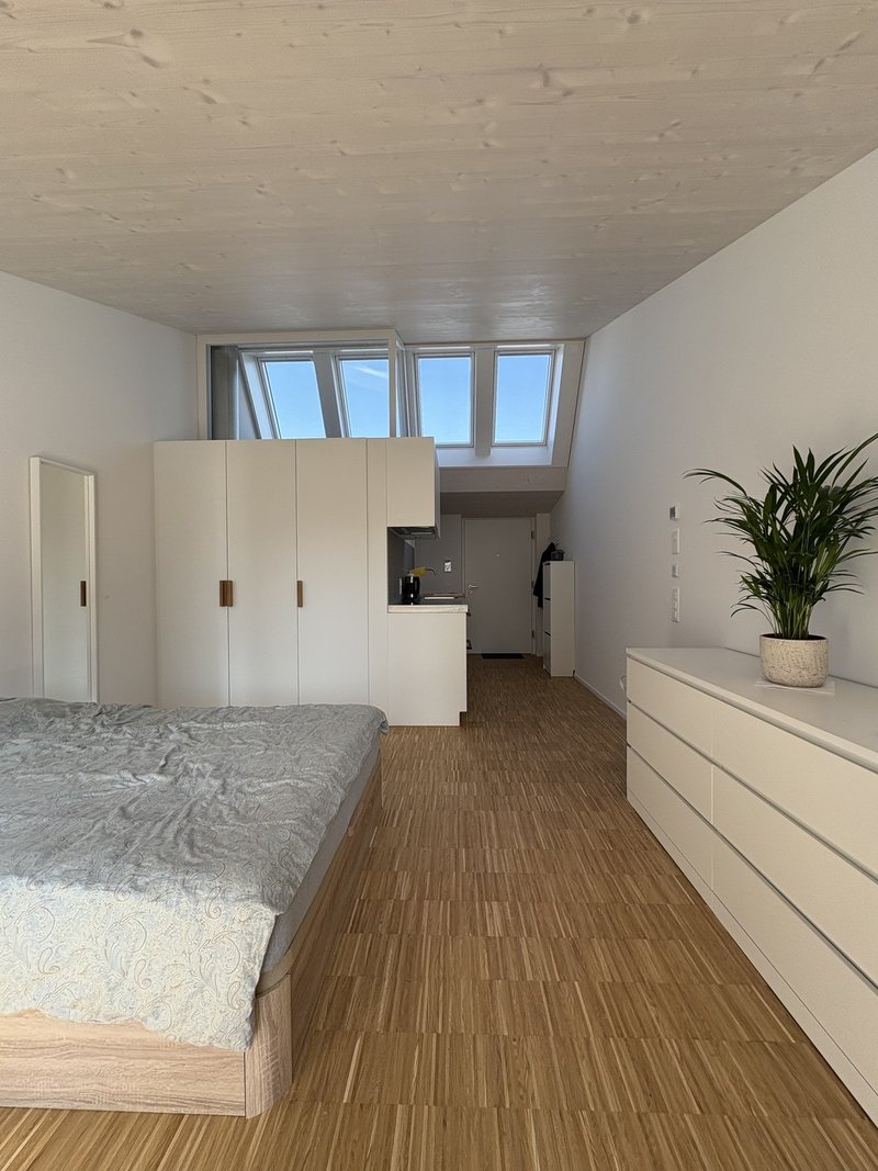 A bright and modern fully furnished studio apartment in Zurich Triemli, available from 1 April 2026 for a temporary stay of 3 to 6 months.
