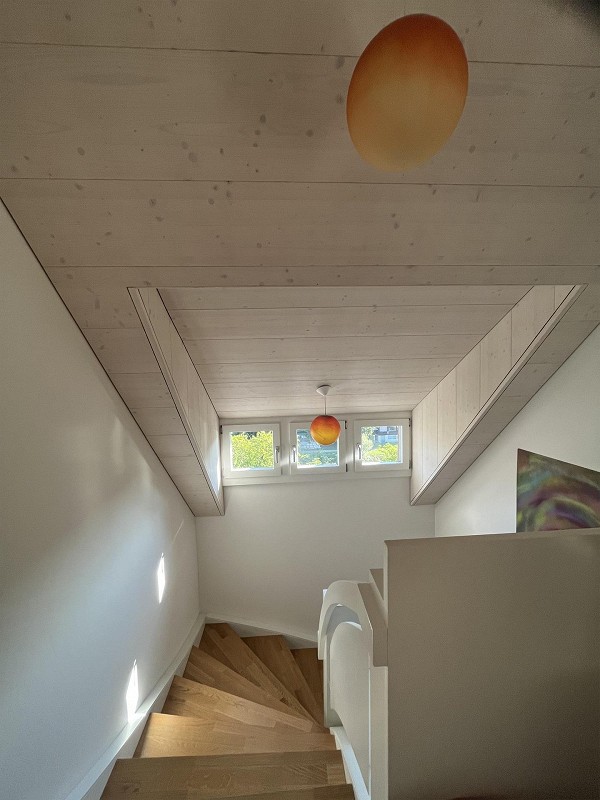 - Unteres Geschoss: Offene Küche mit Insel, Geschirrspüler und Glaskeramik, Wohnzimmer mit Cheminée, Grosses Schlafzimmer mit Einbauschrank und direktem Zugang zu Badezimmer mit Dusche, weiteres Zimmer mit Einbauschrank, Sep. Gäste-WC, grosser gedeckter Balkon mit Sonnenstoren über die gesamte Länge der Wohnung