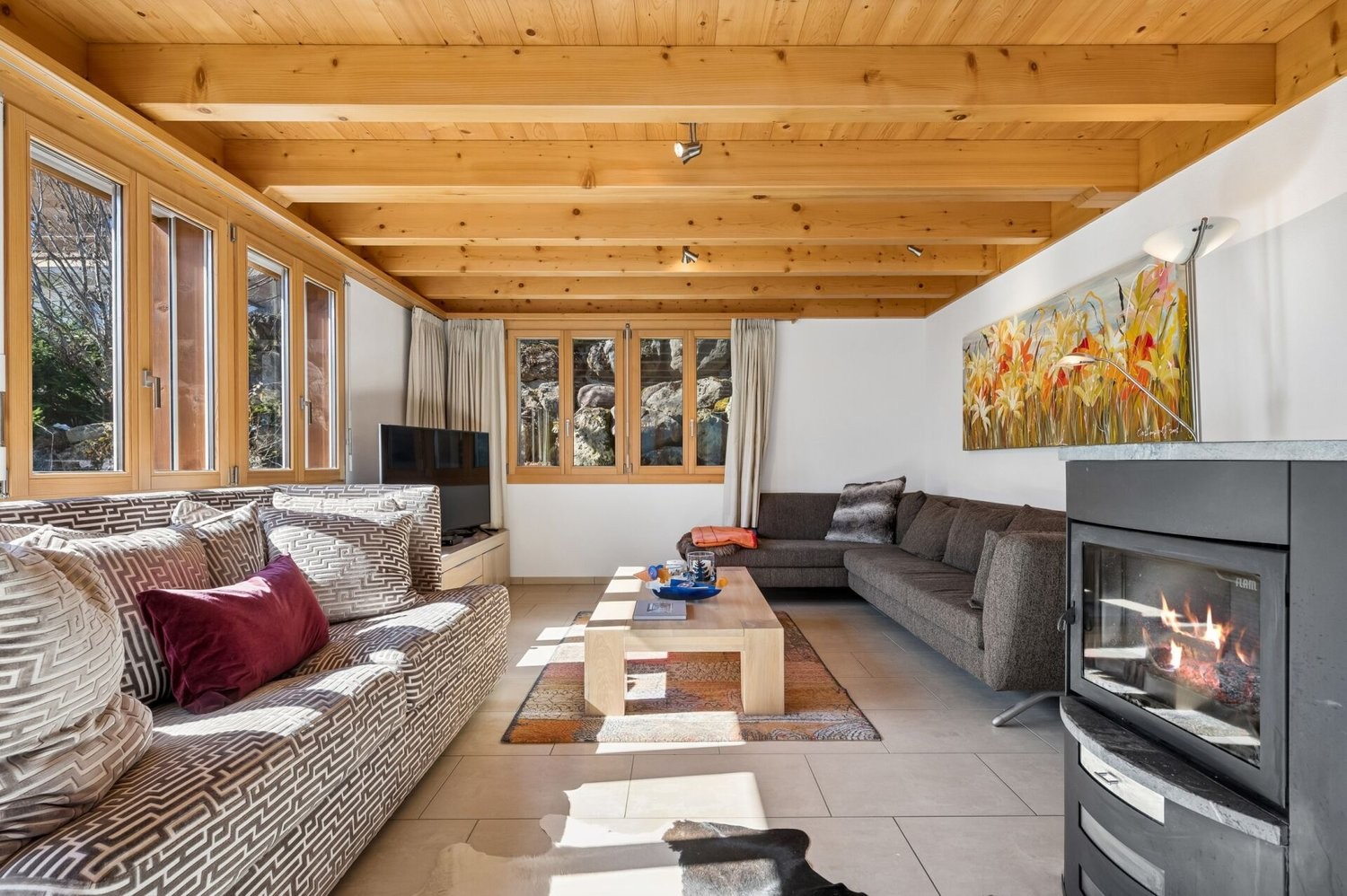 Über die innenliegende Treppe, welche sämtliche Geschosse miteinander verbindet, gelangen Sie in das Erdgeschoss. Dieses bildet den zentralen Wohnteil des Hauses. Der offen gestaltete Wohn- und Essraum wird durch grosse Fensterflächen geprägt, welche viel Tageslicht einbringen und den Blick in die umliegende Landschaft freigeben. Das Cheminée schafft eine angenehme Atmosphäre. Die Aussenflächen sind direkt angebunden. Ein Balkon erweitert den Innenraum und ermöglicht einen freien Blick in die Bergwelt. Ergänzend besteht ein Sitzplatz, der als offener Aufenthaltsort im Freien genutzt werden kann.