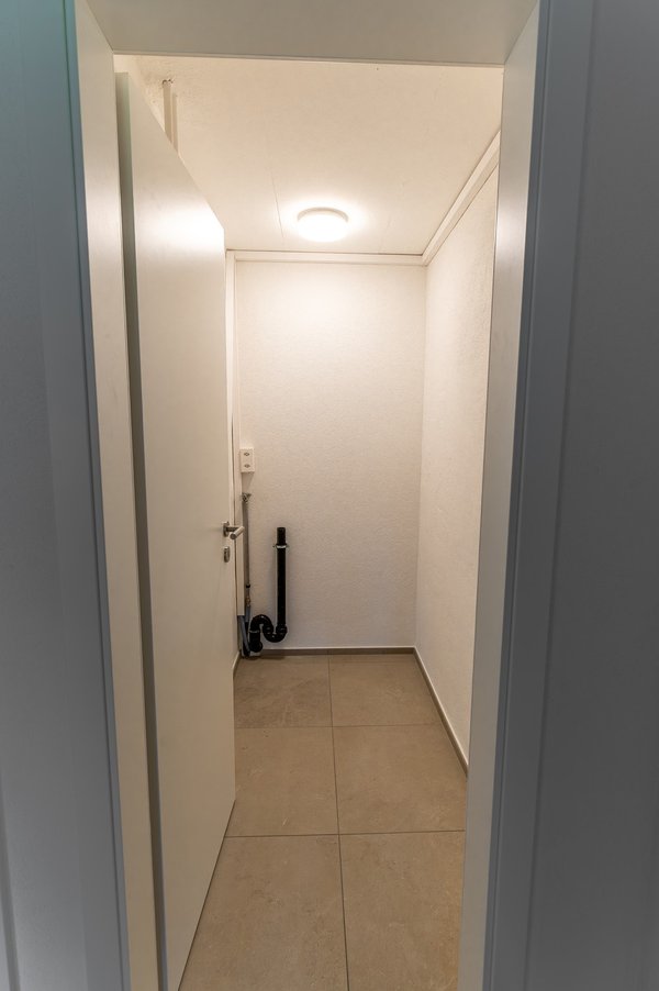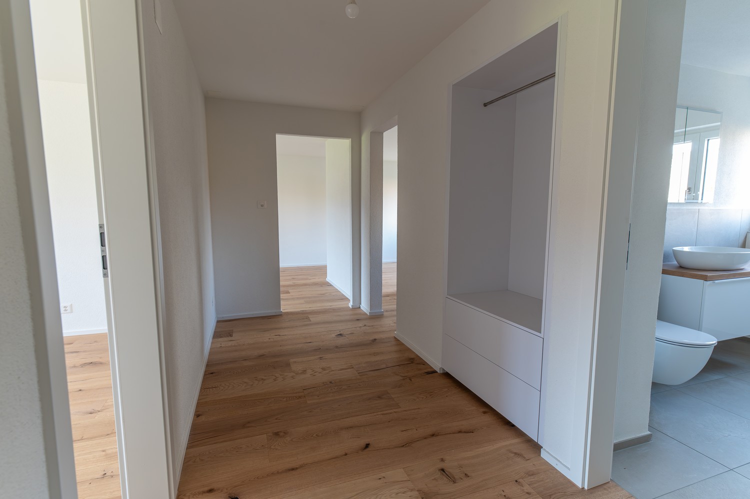 Anschlüsse für Waschmaschine und Tumbler sind vorhanden. Leerrohre für elektrische Storen sind vorbereitet. Ein moderner Einbauschrank im Gang bietet zusätzlichen Stauraum.