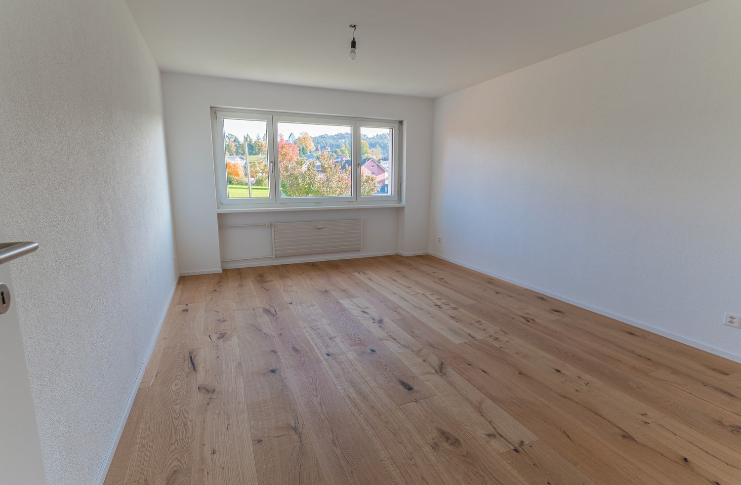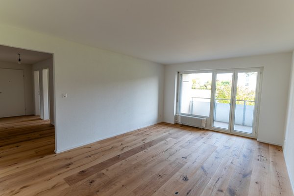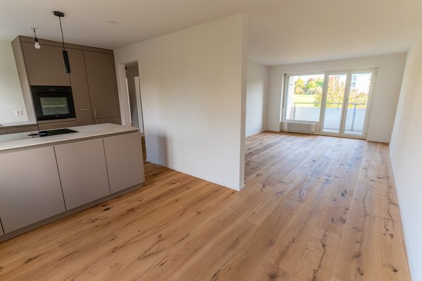 Parkettboden und weiss gehaltene Wände schaffen eine freundliche, einladende Wohnatmosphäre mit viel Tageslicht.
