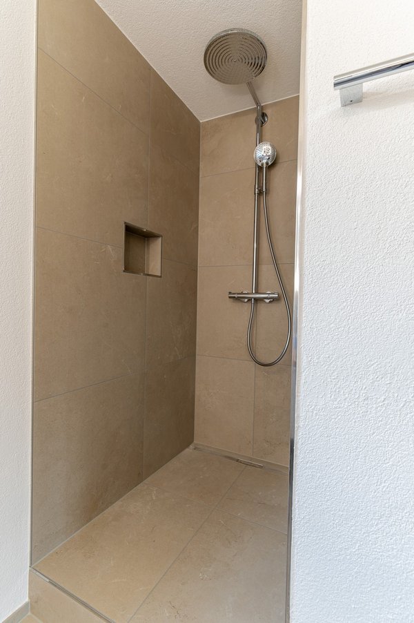 Eleganter Spiegelschrank und praktischer Lavabo-Unterschrank bieten viel Stauraum. Bodenheizung und eine begehbare Dusche sorgen für Komfort und Funktionalität.