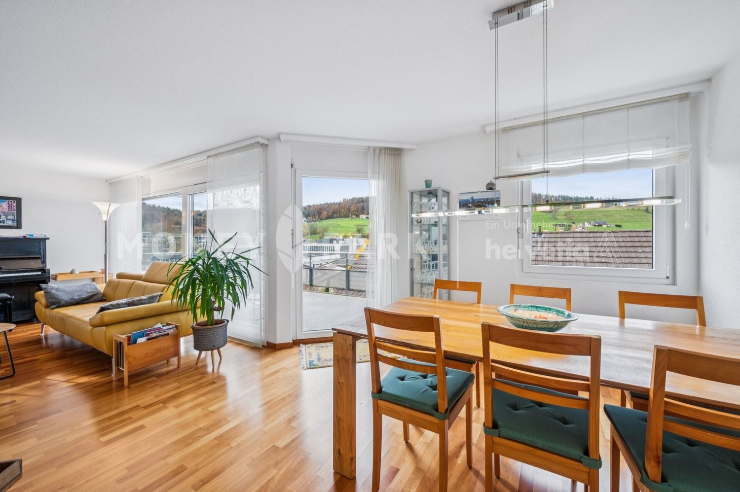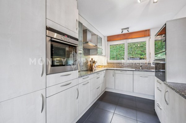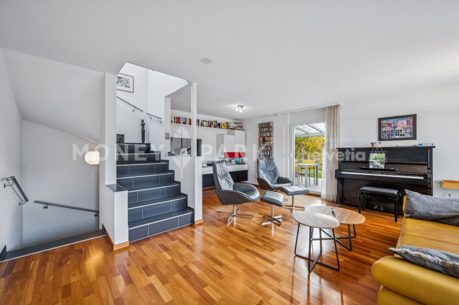 Vom Sockelgeschoss gelangen Sie über eine schöne Treppe ins Erd- geschoss mit zeitloser Küche und offenem Wohn-/ Essbereich. Die grossen Fensterfronten sorgen für eine einladende Atmosphäre und hohen Wohnkomfort. Von hier aus haben Sie einen direkten Zugang zum Balkon mit herrlichem Weitblick. Diese unverbaute Aussicht geniessen Sie auch von der Terrasse und dem idyllischen Garten.