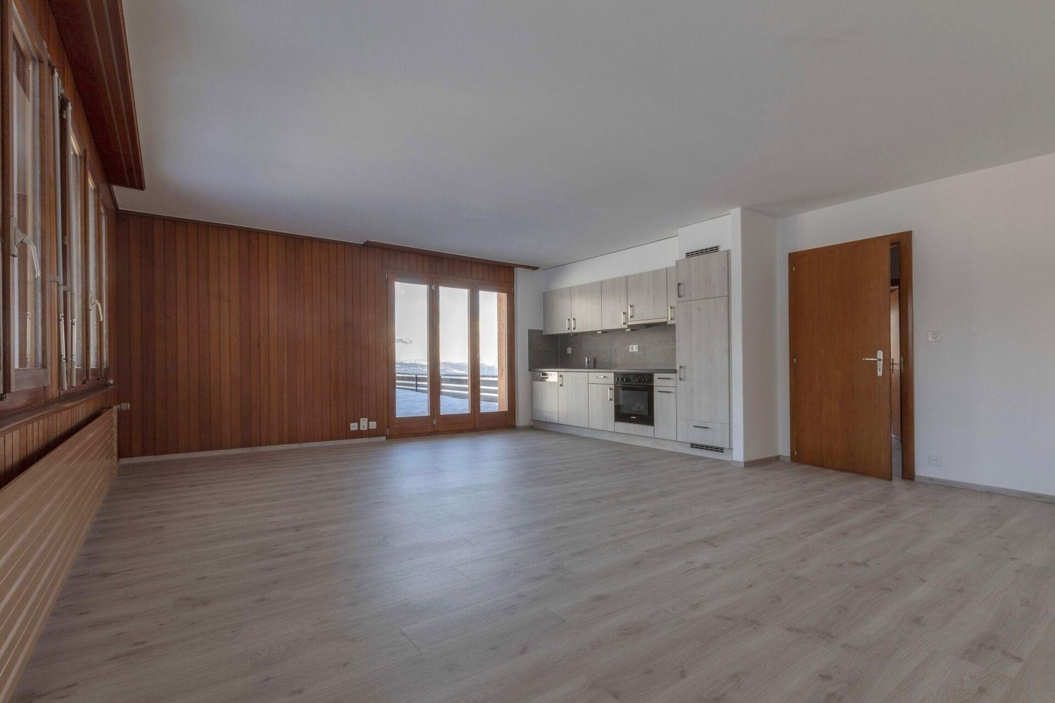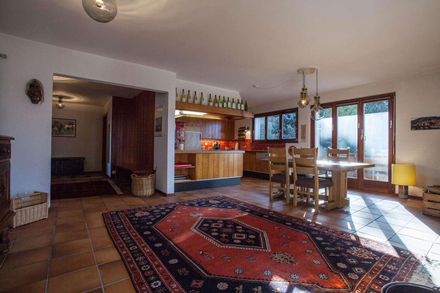 Im Erdgeschoss sind der Heizungsraum, der Tankraum, ein Carnotzet, die Waschküche sowie eine separate Toilette vorhanden. Weiter verfügt die Liegenschaft auf dieser Etage über eine neu sanierte 4.5-Zimmer-Wohnung von 96.4 m² mit Terrasse und Balkon. Im 1. Obergeschoss angekommen, präsentiert sich den Bewohnern der ansehnliche und äusserst geräumige Hauptwohnbereich dieser Liegenschaft mit einem unvergleichlichen Raumgefühl. Die helle und geräumige Küche bietet alles was in den 70er-Jahren denkbar war und ist zum Essbereich hin offen gestaltet.