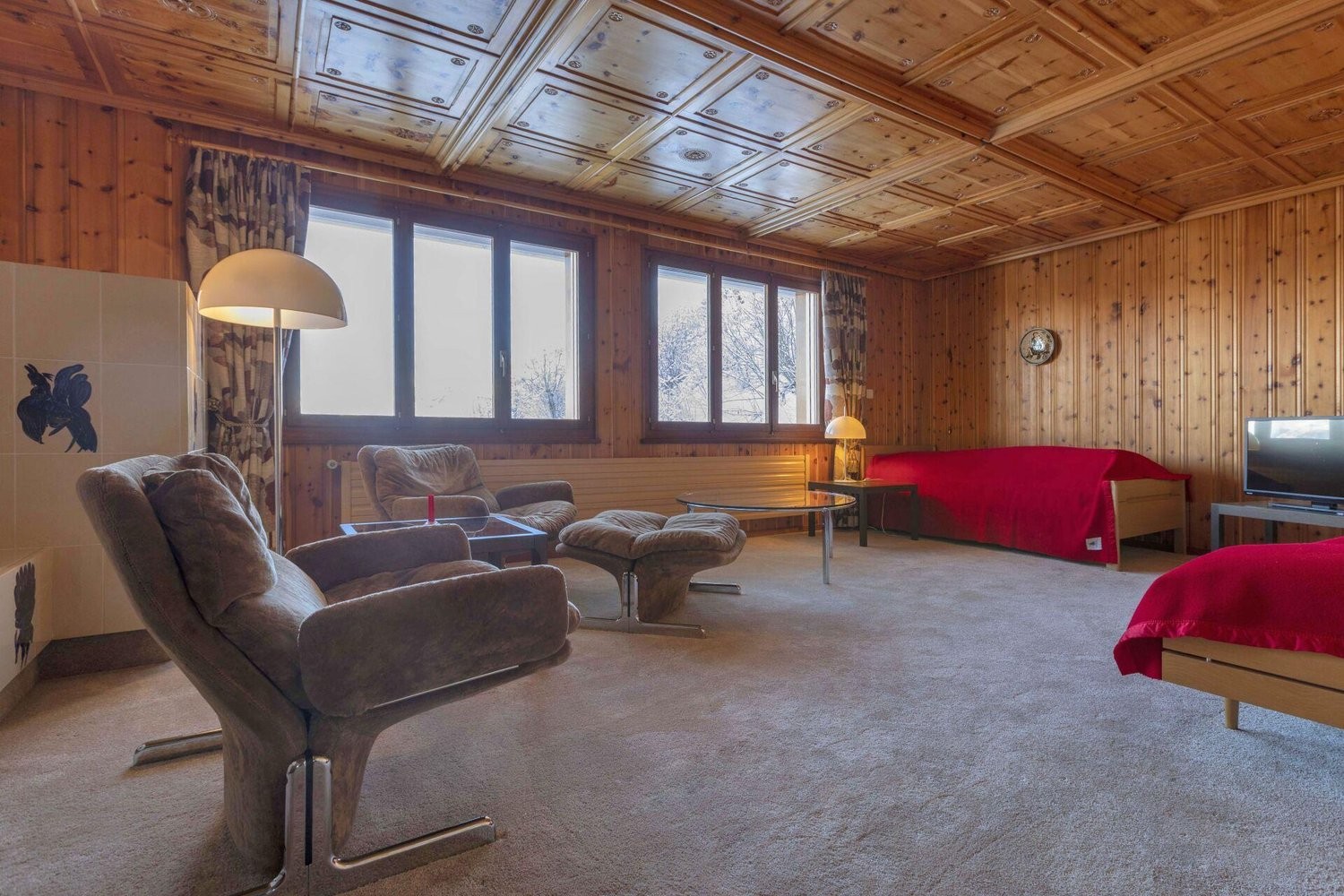 Vom angrenzenden Balkon mit diversen Zugängen, welcher von der West bis hin zur Ostfassade verläuft und über 67 m² gross ist, erstrahlt das Bergpanorama erneut von seiner schönsten Seite. Das einzigartige Arven-Zimmer wurde mit aufwändigen und heute kaum noch erschwinglichen, handgeschnitzten Ornamenten ausgestattet und erstrahlt dadurch im typischen Chalet-Charakter mit äusserst viel Charme.