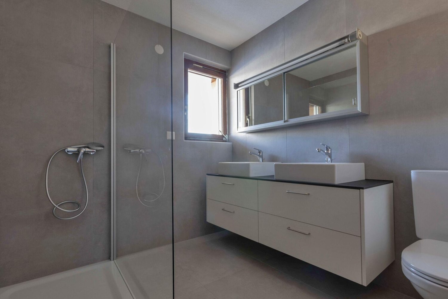 Die Schlafzimmer geniessen beide den direkten Zugang auf den U-förmigen Balkon mit Weitblick übers Rhone-Tal. Zusätzlich zur separaten Gäste-Toilette mit Dusche hat es ein Badezimmer mit Badewanne, separater Dusche und einer weiteren Toilette in dieser Wohnung.