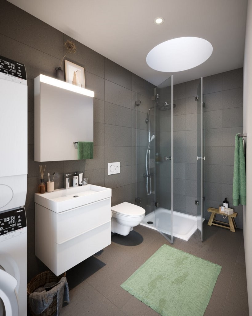 - Helles Badezimmer mit Bodenplatten verfügt über eine Dusche