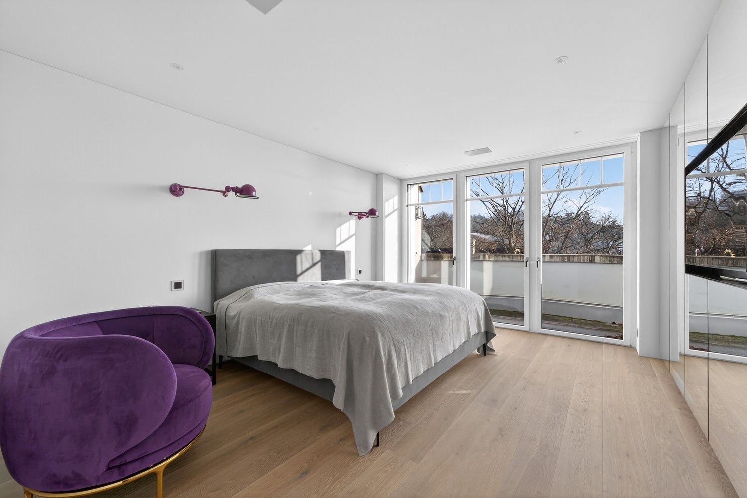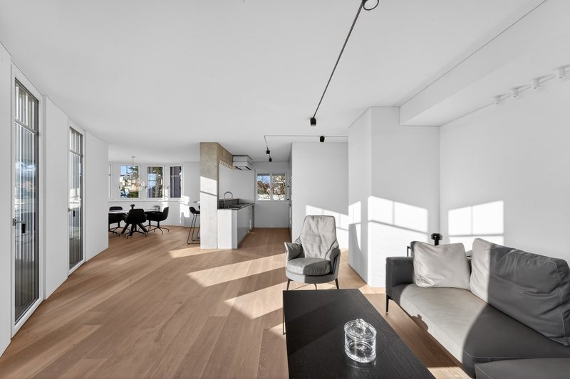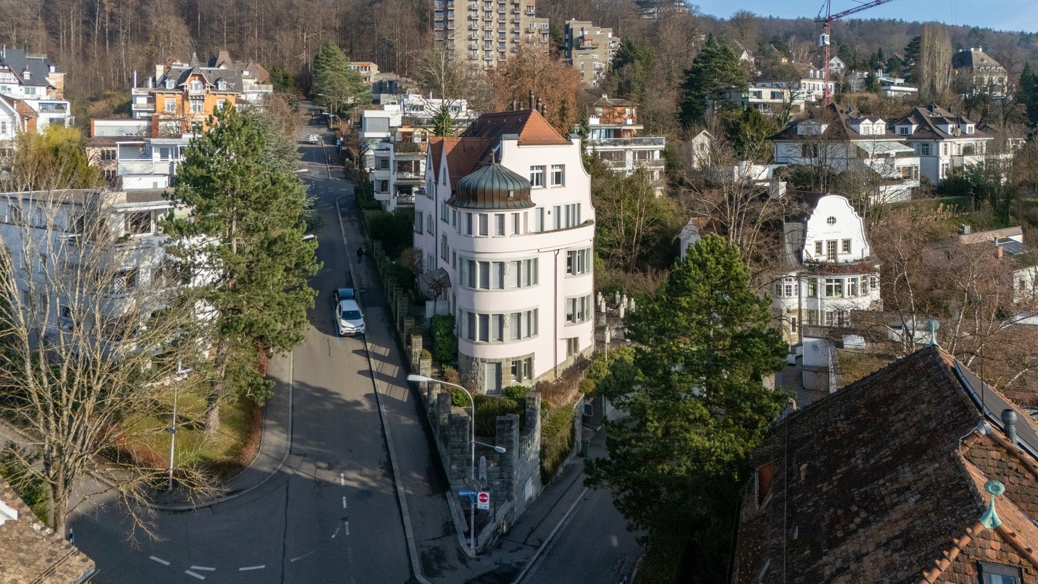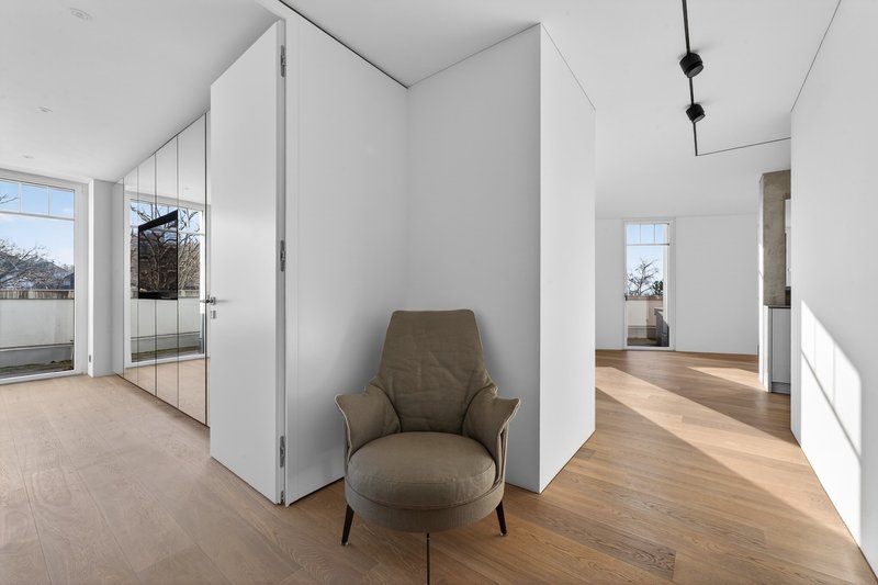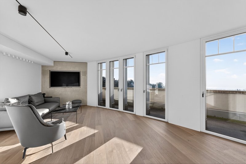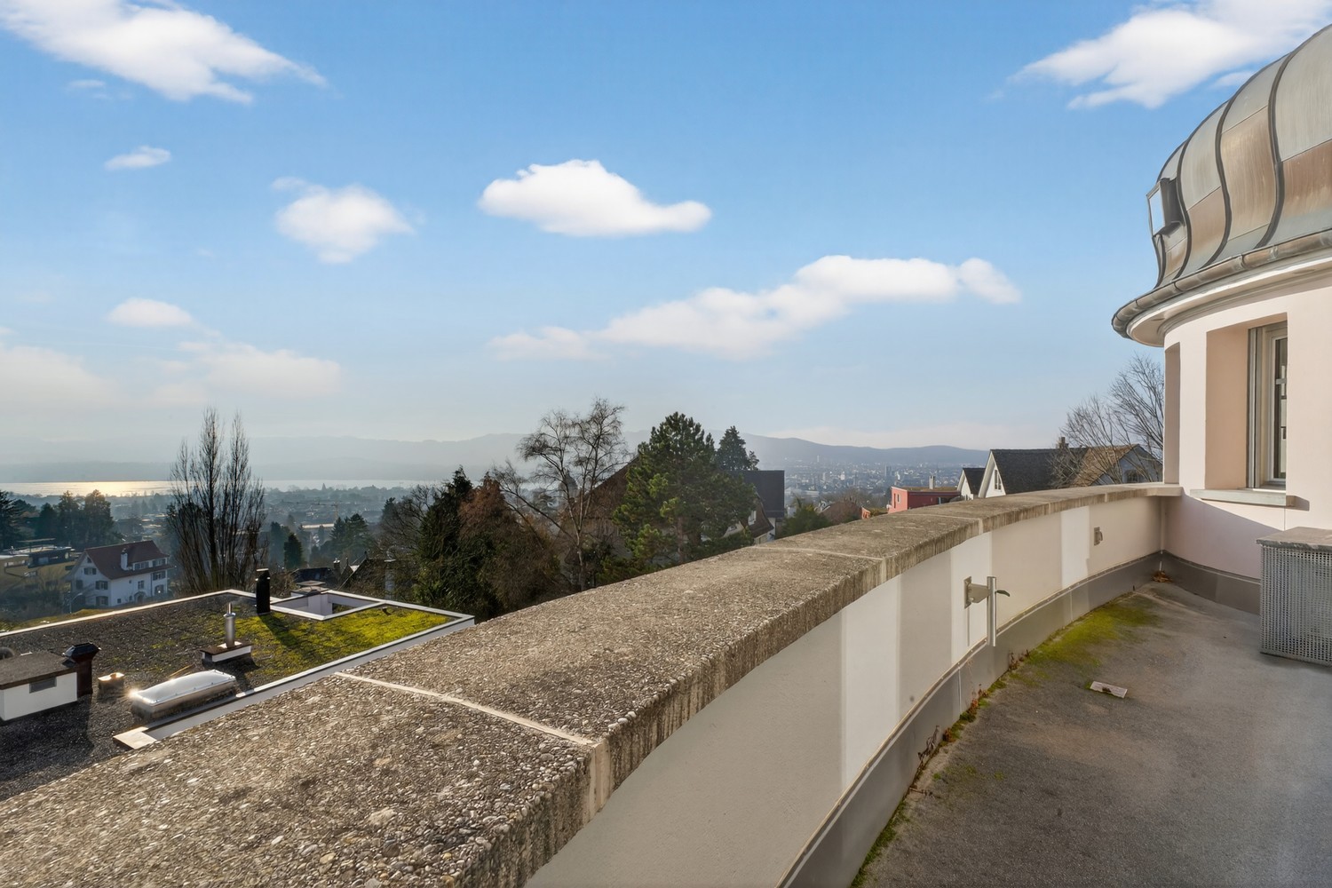 Die Wohnung liegt im 3. Obergeschoss und ist mit dem Lift direkt erreichbar. Sie bietet rund 125 m² Wohnfläche, einen durchdachten Grundriss sowie eine eindrückliche Aussicht über die Stadt Zürich bis zum Zürichsee. Die hochwertige Möblierung unterstreicht den repräsentativen Charakter der Wohnung und schafft ein ruhiges, elegantes Wohnambiente.