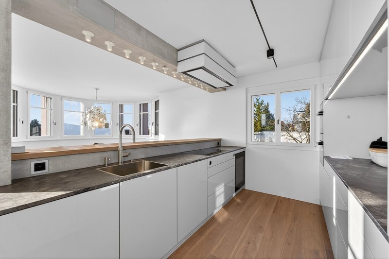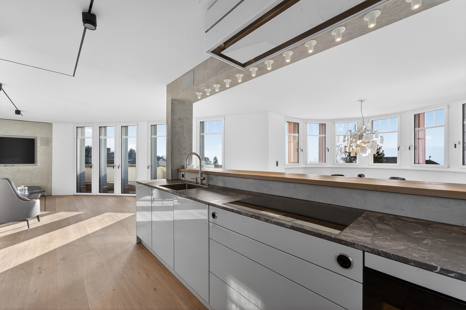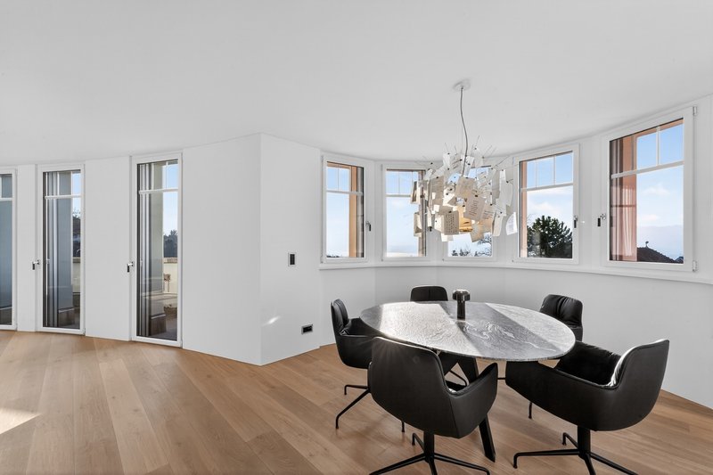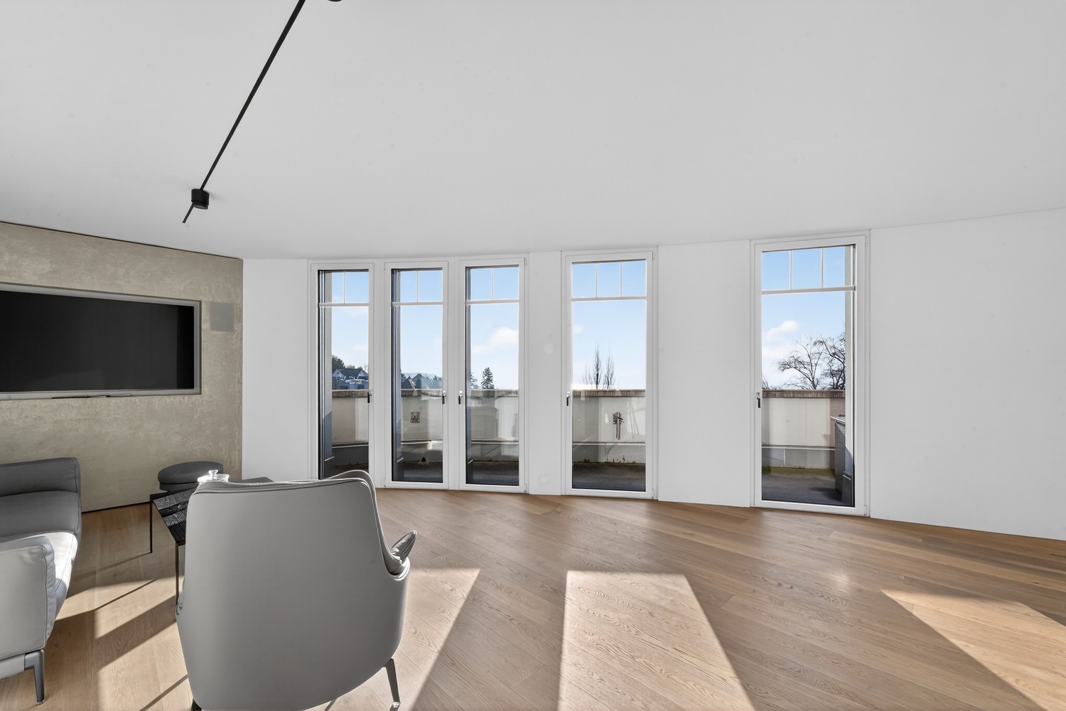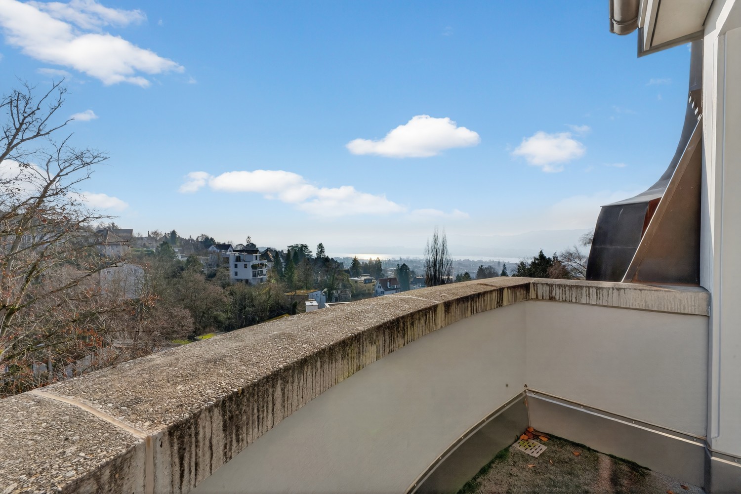 Die Wohnung liegt im 3. Obergeschoss und ist mit dem Lift direkt erreichbar. Sie bietet rund 125 m² Wohnfläche, einen durchdachten Grundriss sowie eine eindrückliche Aussicht über die Stadt Zürich bis zum Zürichsee. Die hochwertige Möblierung unterstreicht den repräsentativen Charakter der Wohnung und schafft ein ruhiges, elegantes Wohnambiente.