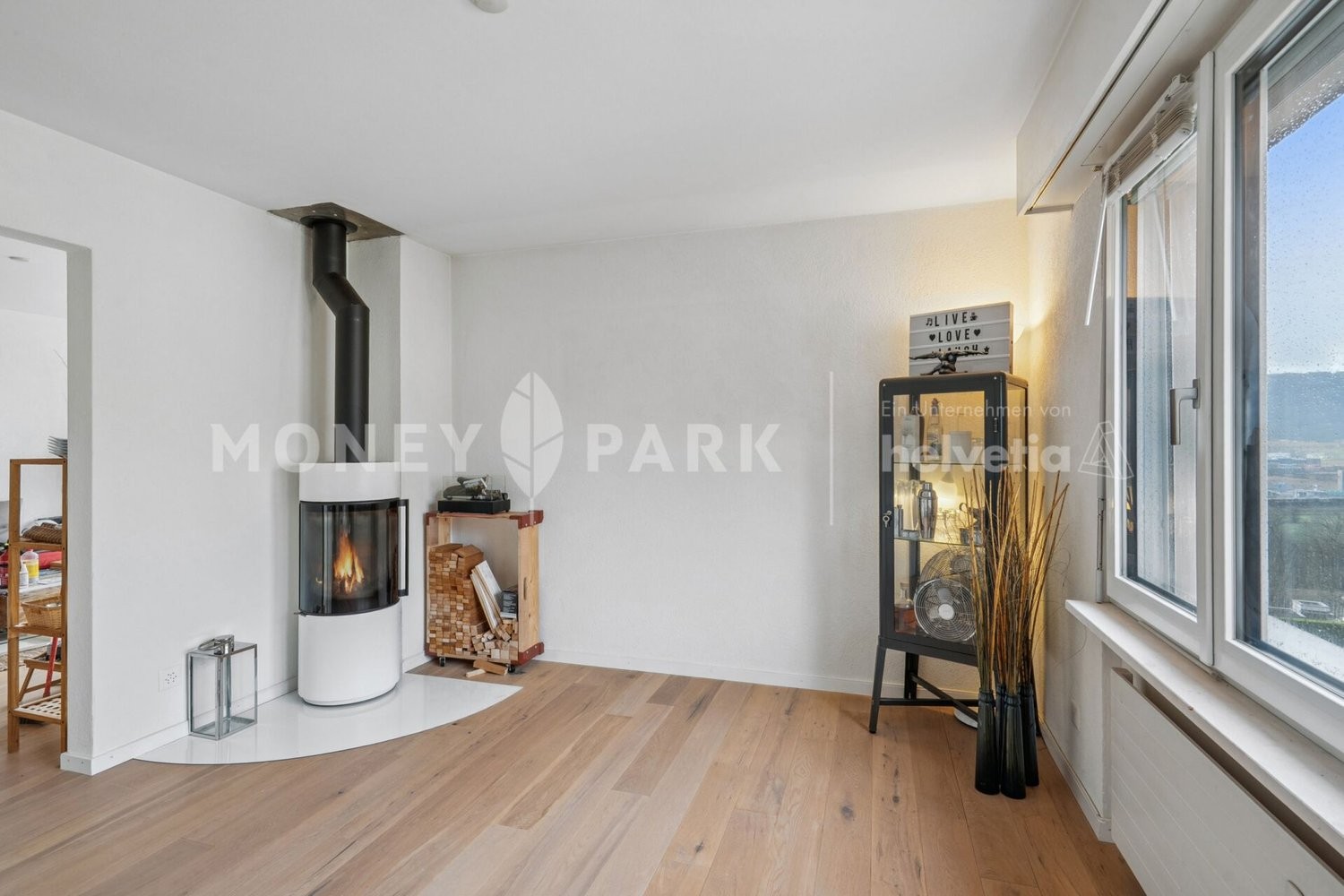 Von hier aus gelangen Sie in den hellen Wohnbereich, der durch grosse Fensterflächen viel Tageslicht und eine schöne Aussicht bietet. Der direkte Zugang zum grosszügigen Balkon erweitert den Wohnraum nach aussen und lädt zum verweilen ein. Das angrenzende Esszimmer schliesst direkt an den Wohnbereich an und ergänzt diesen ideal, während der Schwedenofen dem Raum eine warme, behagliche Wohnatmosphäre verleiht. Die separat angeordnete, funktionale Küche wird ergänzt mit einem gemütlichen Balkon, der zusätzlichen Komfort im Alltag schafft.