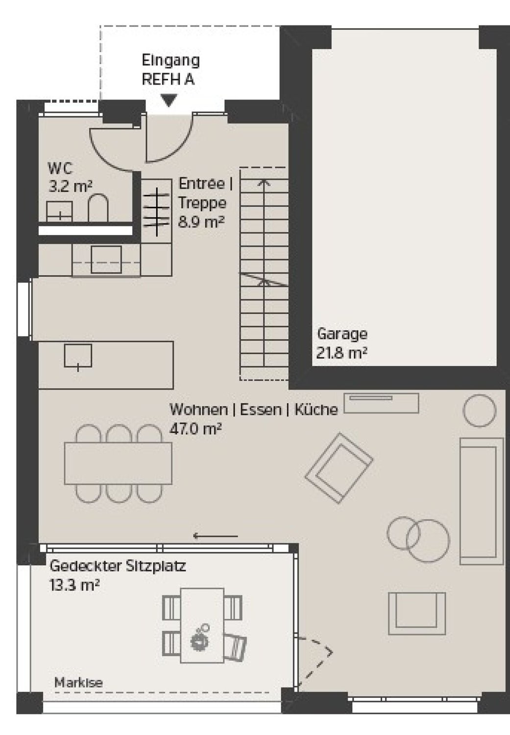 Im Eingangsgeschoss erwartet Sie ein praktisches Entrée mit Garderobe, welches Sie in den grosszügigen Wohn-/Essbereich mit offener Küche und direktem Zugang zur gedeckten Terrasse führt. Zusätzlich findet sich in diesem Geschoss eine Gästetoilette mit indirektem Tageslicht, Lavabo und WC.