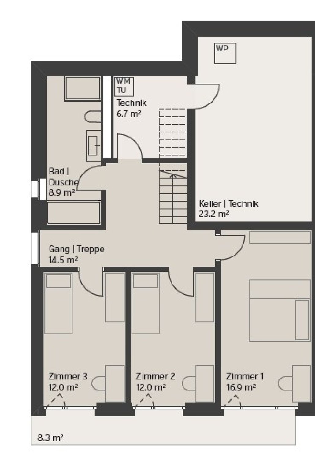 Über die Treppe gelangen Sie ins helle Gartengeschoss, welches einen grosszügigen, hellen Erschliessungsbereich und drei schöne Schlaf-/Arbeitszimmer mit direktem Gartenzugang beherbergt. Im Sommer lässt sich das Leben in den wunderbaren Garten verlegen, welcher mit viel Grün verwöhnt. Weiter findet sich ein grosszügiger Nassraum mit viel Tageslicht sowie Dusche, Badewanne, Waschtisch und Toilette im Gartengeschoss. Zudem beherbergt diese Ebene die praktische Waschküche und einen grossen Technik-/Kellerraum.