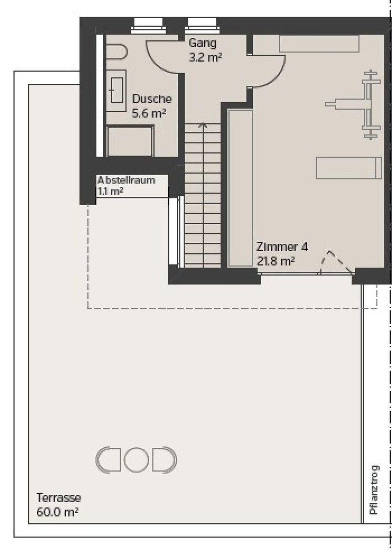 Das Attikageschoss verwöhnt mit viel Licht, Grosszügigkeit und Weitsicht. Der Masterbedroom mit Badezimmer en suite und Zugang zur 60 m² grossen Terrasse vervollständigt das Raumangebot dieser überzeugenden Liegenschaft.