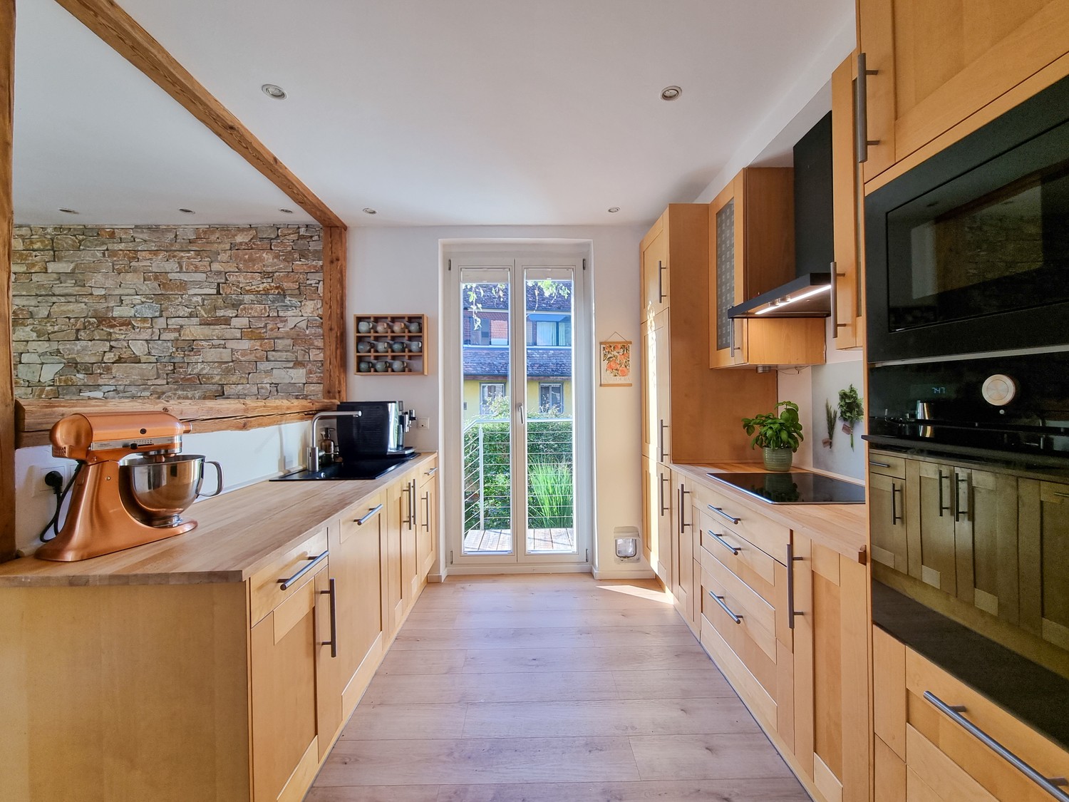 Offene lichtdurchflutete Küche mit viel Stauraum und direktem Zugang zum Garten.
