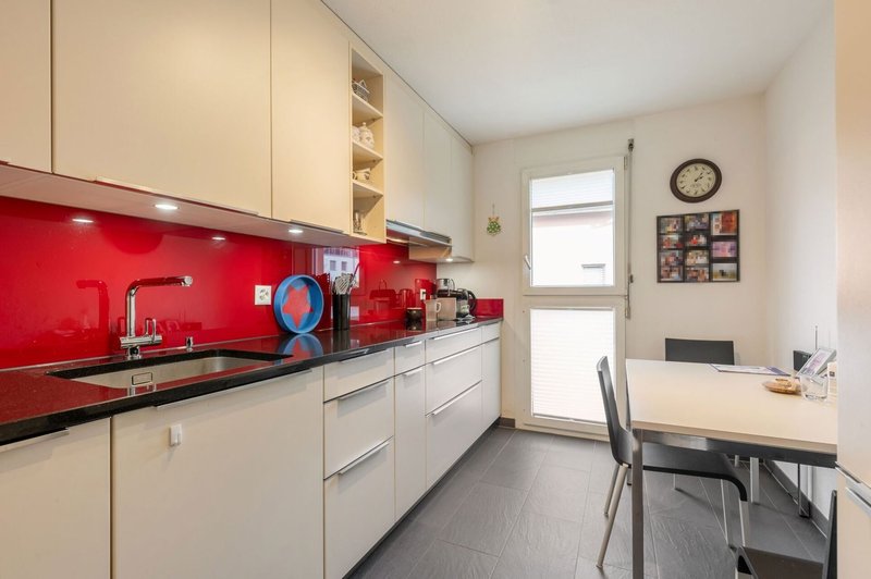 Der Eingangsbereich im 1. Obergeschoss (ohne Aufzug) erschliesst den grosszügigen und lichtdurchfluteten Wohn- und Essbereich. Die geschlossene Küche bietet viel Ablagefläche und Platz für einen kleinen Tisch - ideal für das Frühstück oder einen gemütlichen Kaffee.