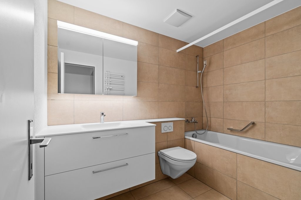 - Badezimmer mit WC, Lavabo, Spiegelschrank und Badewanne