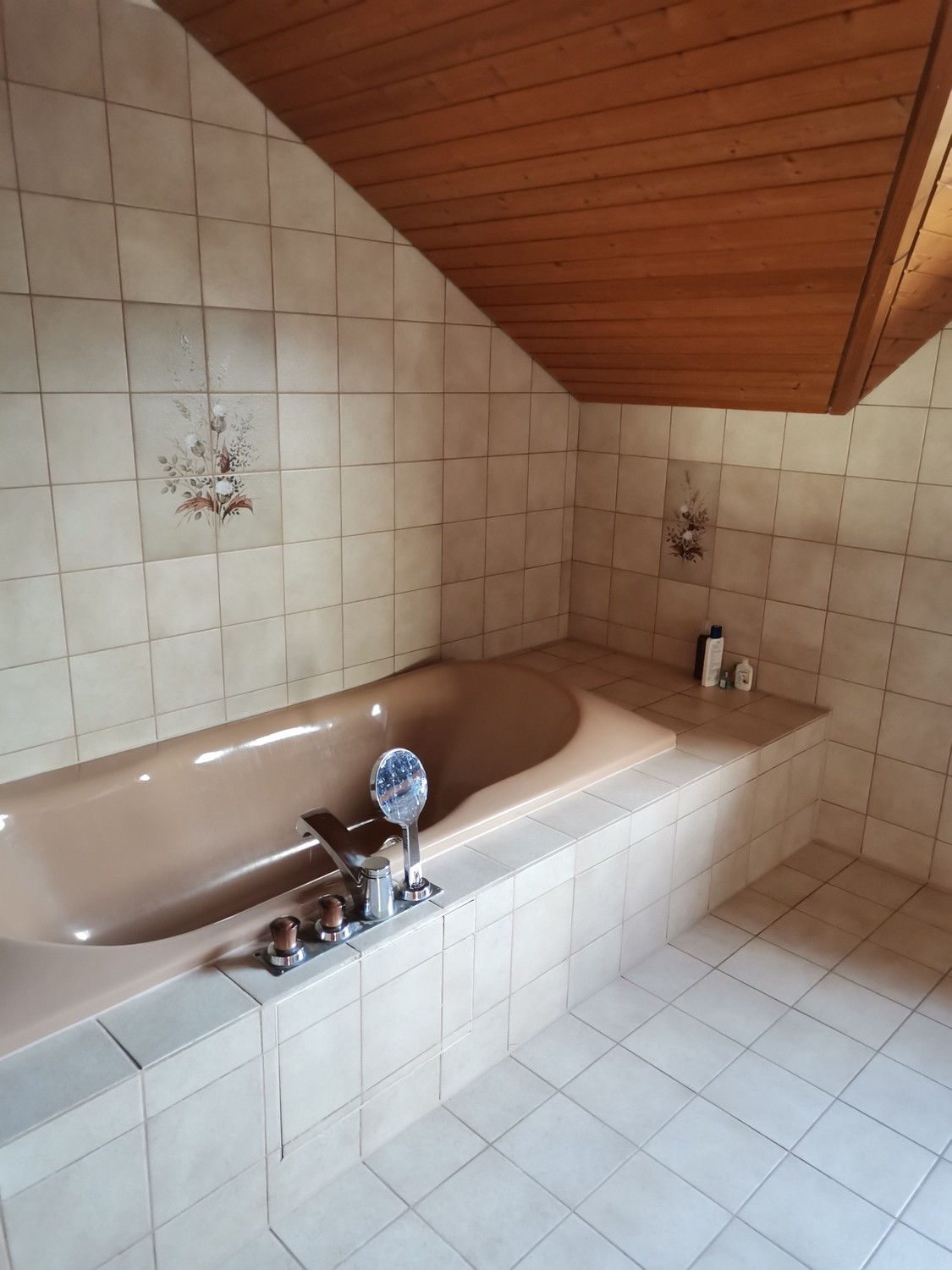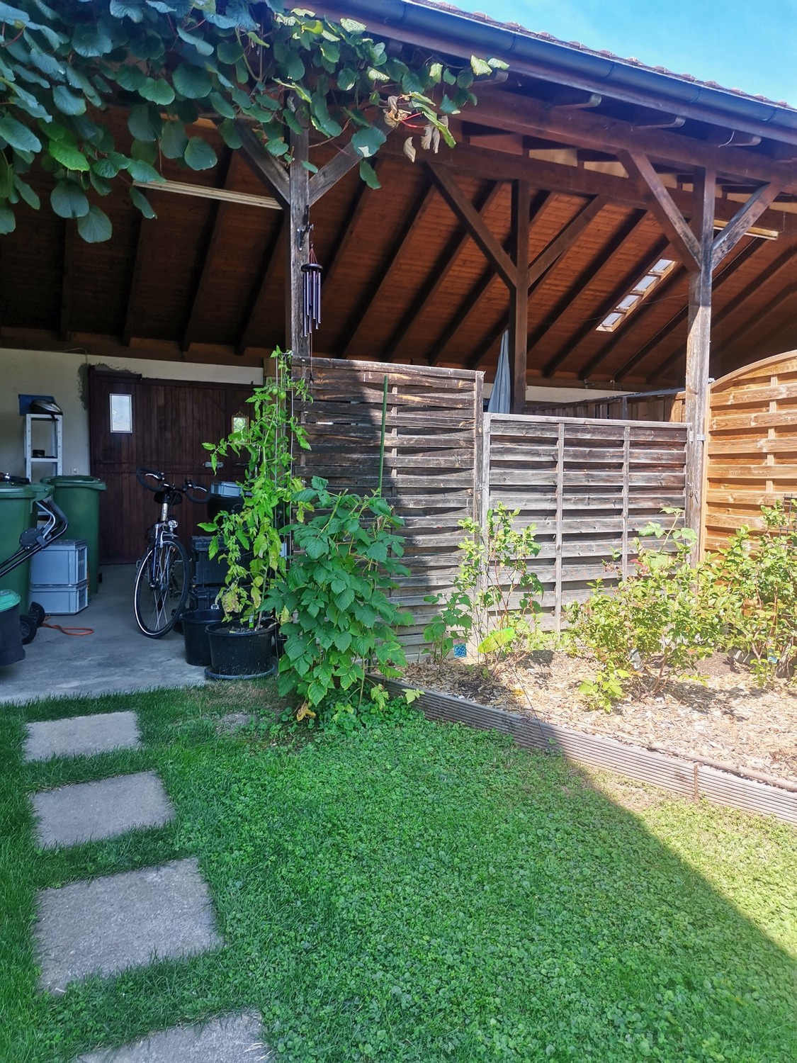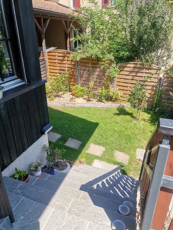Das Haus verfügt über einen grossen Wohn-, Essbereich mit Keramikplatten und Chemine sowie eine Terrasse mit Abgang zum Garten.