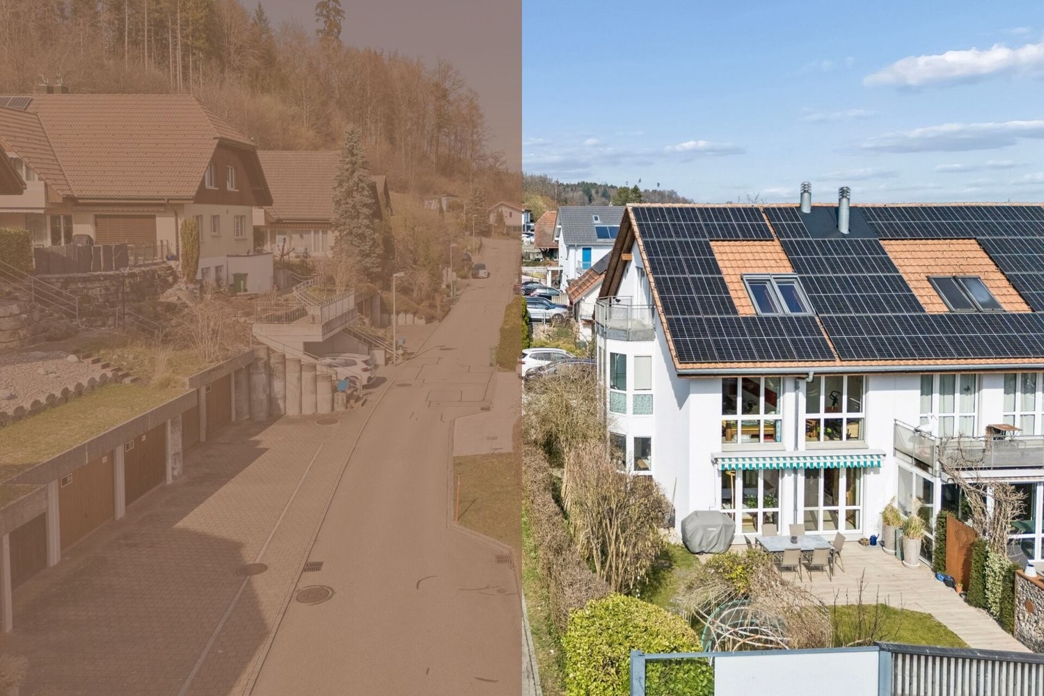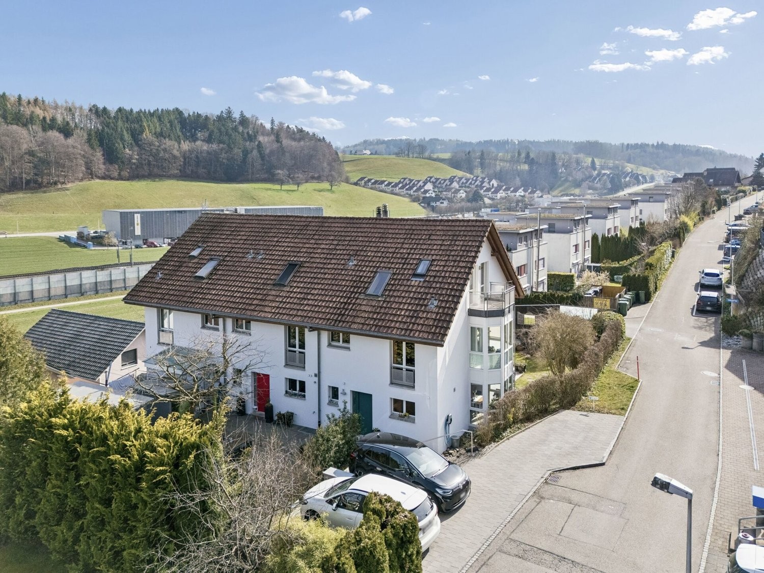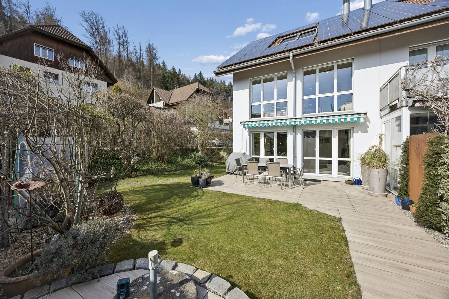 Dieses Reiheneckhaus überzeugt durch seine ruhige Quartierlage sowie ein angenehmes Wohnumfeld. Im Erdgeschoss empfängt Sie ein Eingangsbereich mit Platz für eine Garderobe. Der Wohn- und Essbereich präsentiert sich hell und offen gestaltet und bietet direkten Zugang zur Terrasse sowie in den grosszügigen, gepflegten Garten mit viel Privatsphäre dank Ecklage. Die Küche ist funktional gestaltet und sinnvoll angeordnet. Diese Etage wird durch ein separates WC ergänzt. Im 1. Obergeschoss befinden sich mehrere flexibel nutzbare Zimmer sowie ein Badezimmer mit Badewanne. Zudem besteht die Möglichkeit, ein zusätzliches Zimmer zu realisieren. Das Dachgeschoss bietet weiteren Raum als Rückzugsort und wird durch eine Nasszelle mit Dusche ergänzt. Ein Keller, Nebenräume sowie eine Waschküche im Untergeschoss runden das Raumangebot ab. Dieses Reiheneckhaus vereint eine durchdachte Aufteilung mit vielseitigen Nutzungsmöglichkeiten und eignet sich ideal für Paare oder Familien, die Wert auf Privatsphäre, Aussenraum und ein angenehmes Wohnumfeld legen.